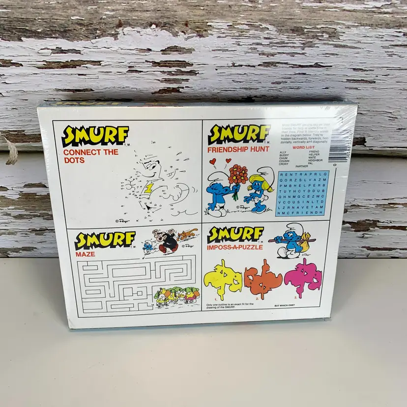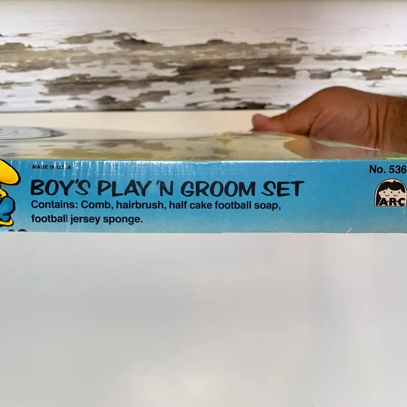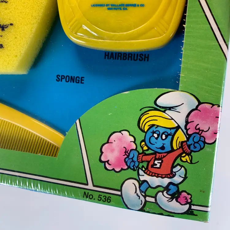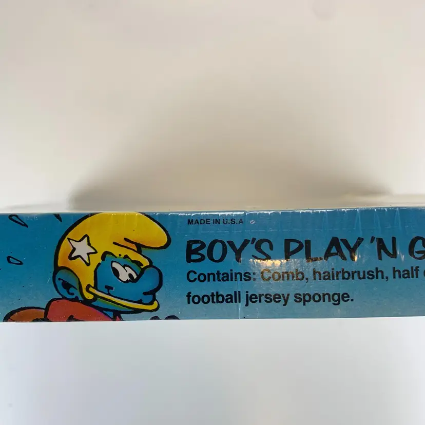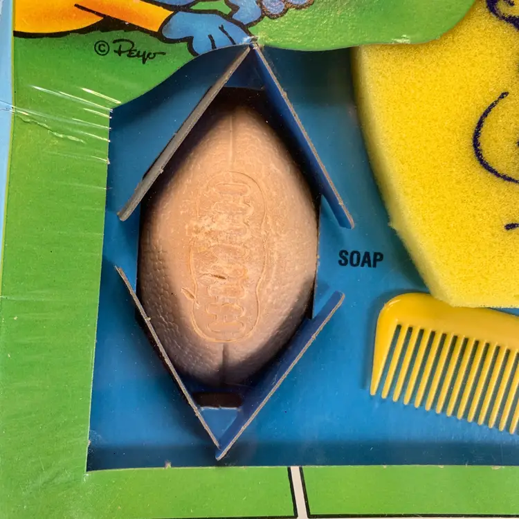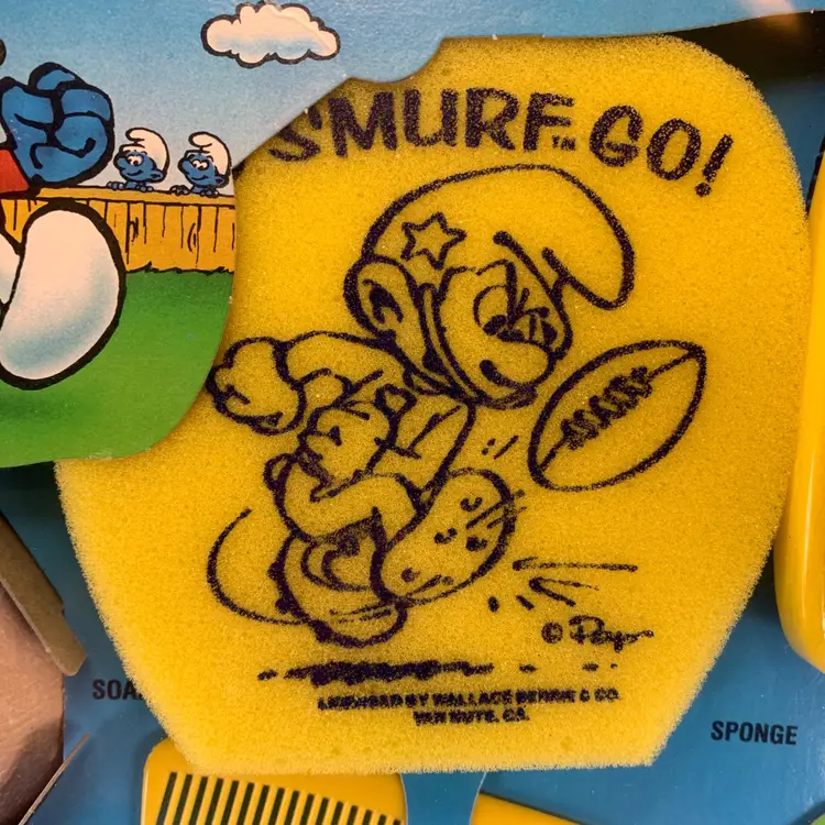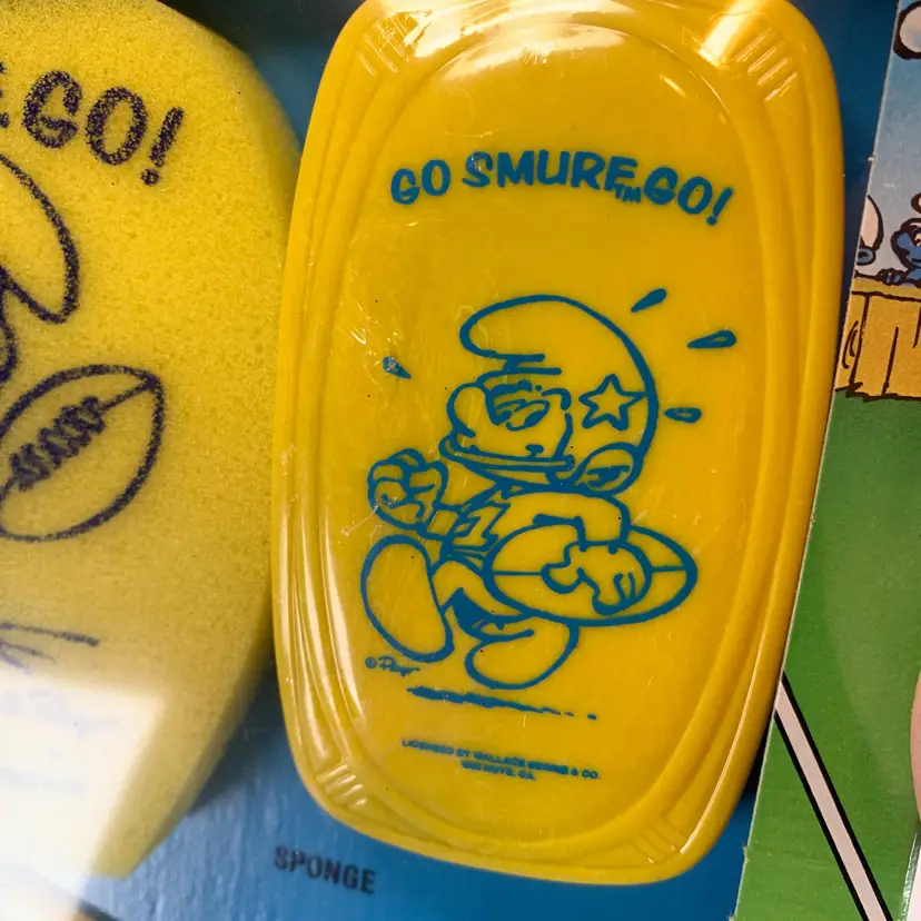 Vintage 1980's Smurf themed bathroom set. Includes Football shaped Soap, Sponge, Hairbrush and Comb. Made in USA