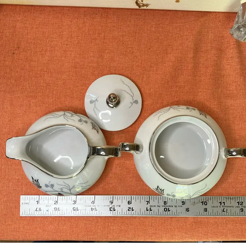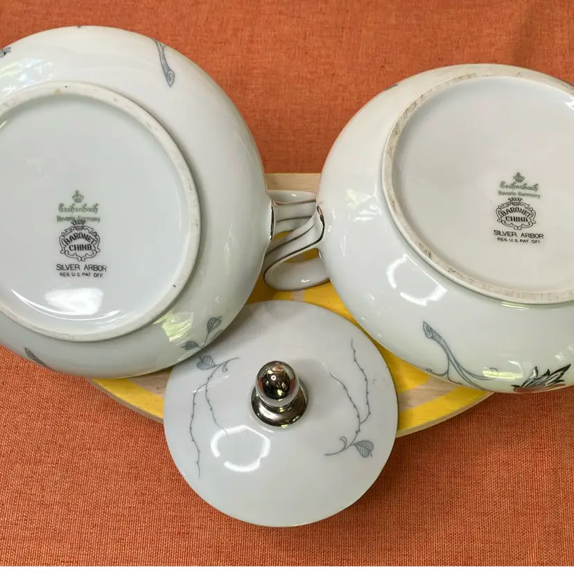 A fav of mine bc of their smushed shape! Marked on bottom Eschenach Germany. Good condition-no chips or cracks. Silver Arbor design.