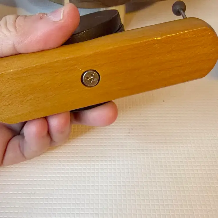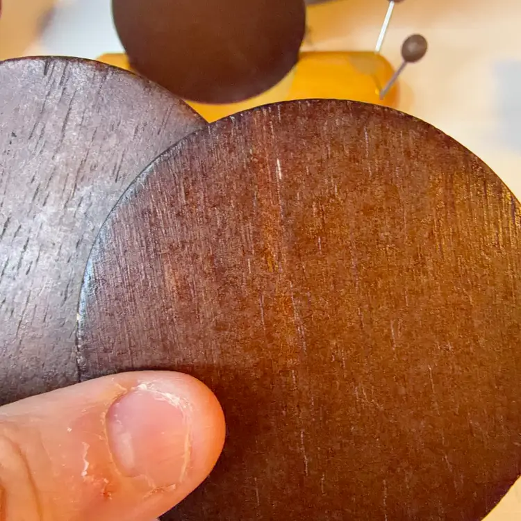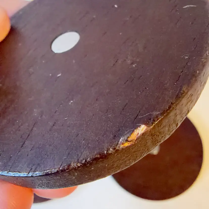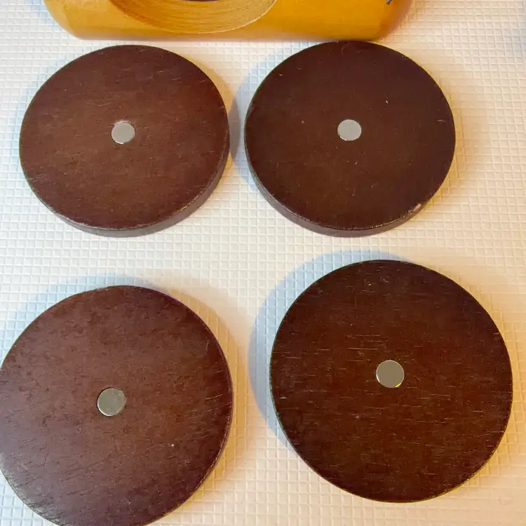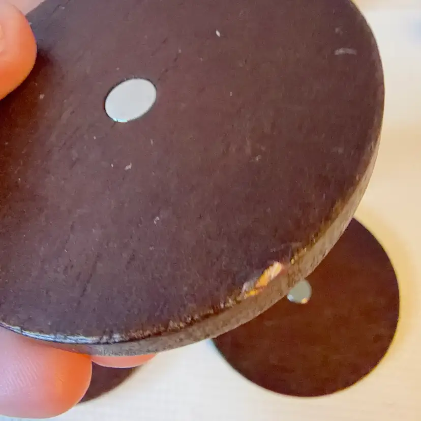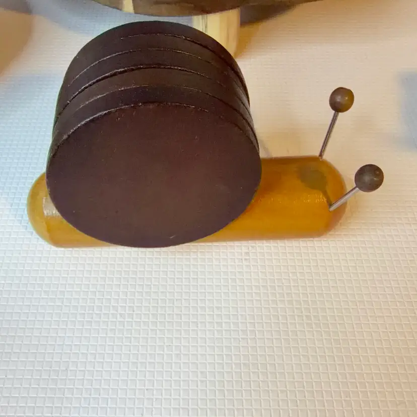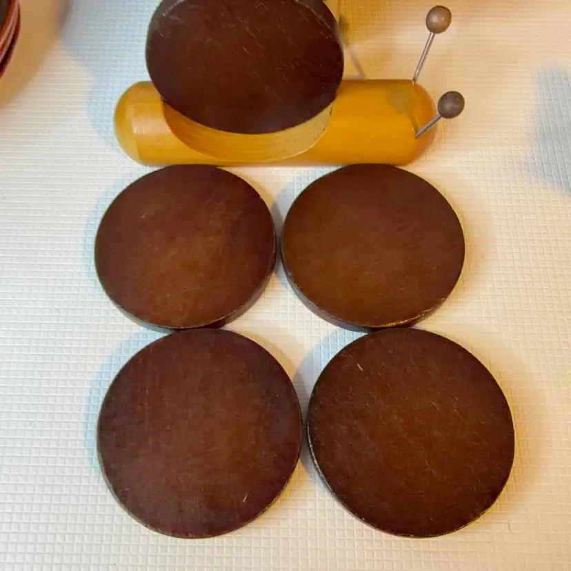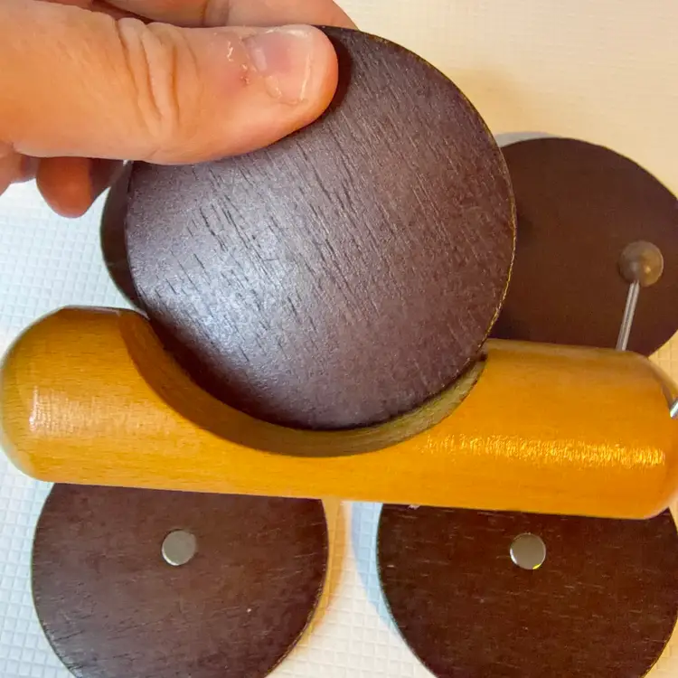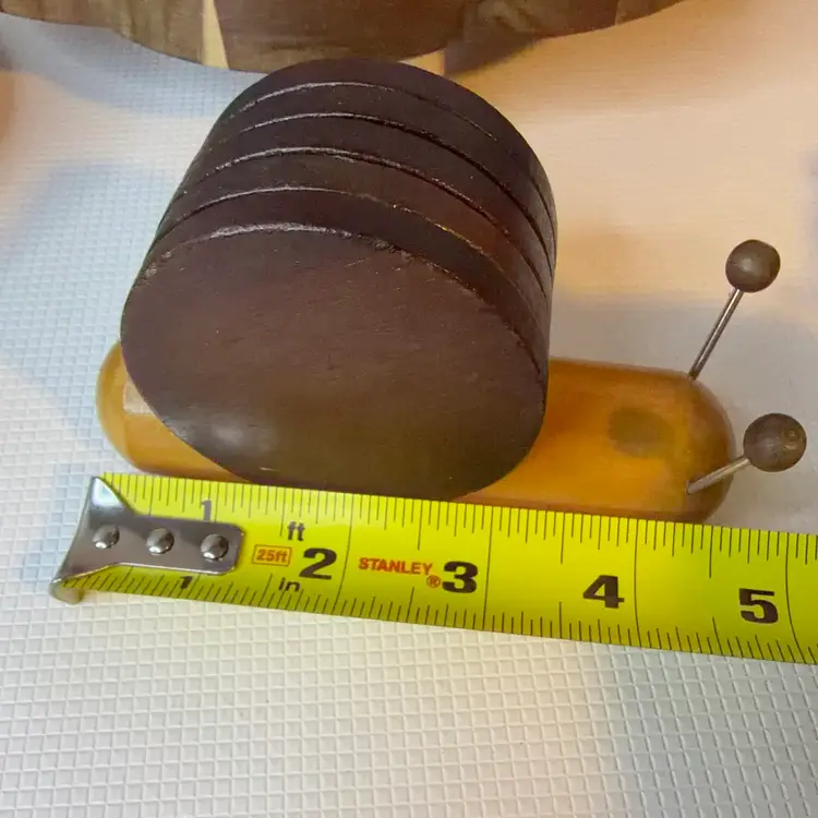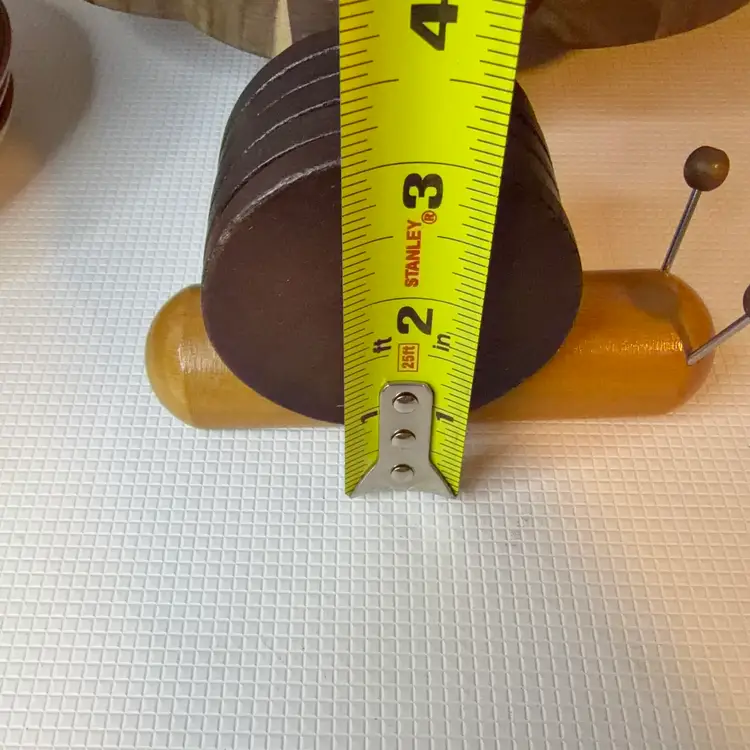 Measures 3” tall and the base is 5”. The middle coaster does not come off it stays so the rest does not fall off and one is missing part of its wood.