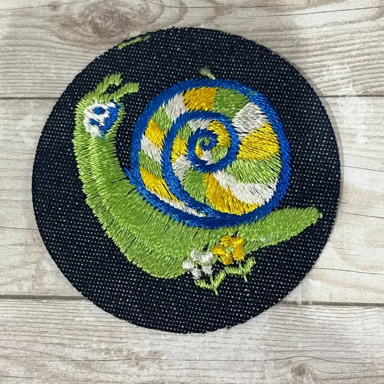 New old stock. Approximately 3 inch round. Embroidered snail on denim. Iron on backing in good condition.