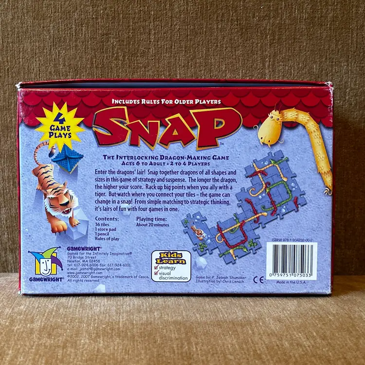 Enter the dragon's lair! Snap together dragons of all shapes and sizes in this game of strategy and suspense. The longer the dragon, the higher your score. Rack up big points when you ally with a tiger. But watch where you connect your tiles- the game can change in a snap! From simple matching to strategic thinking, it's "lairs" of fun with four games in one.