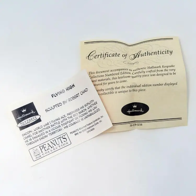 Celebrate Snoopy's adventurous spirit with this #1 Ace figurine. Featuring Snoopy atop his iconic doghouse, this collectible is perfect for any Peanuts fan. Made of durable material, it's a charming addition to your collection. Great for display on desks or shelves! From Hallmark Peanuts Gallery in 2000. About 3" tall.