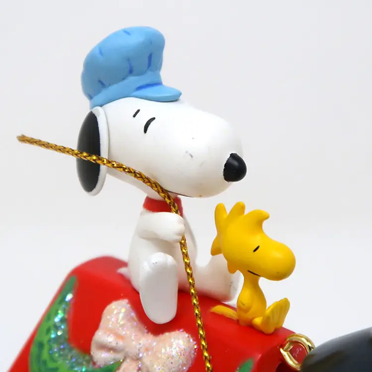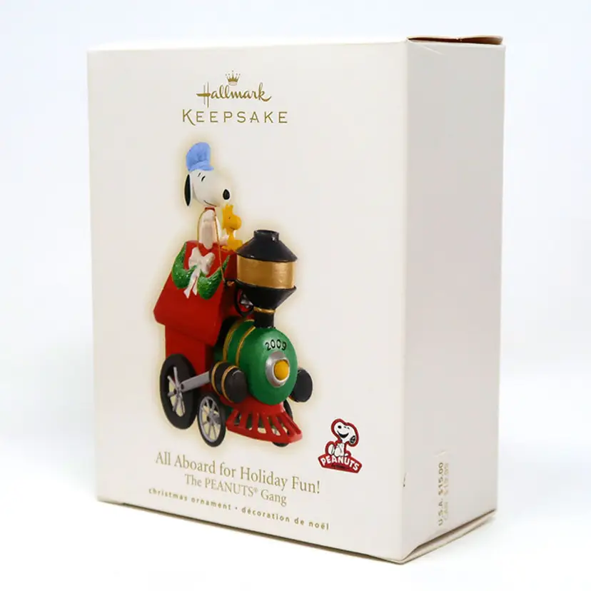 All aboard the Snoopy Christmas train engine! Woodstock and Snoopy are perched atop this train engine decked out for holiday Christmas trees. Made in 2009 by Hallmark ornaments, this Peanuts ornament shows some signs of being used in Christmas past. Comes with the original box.