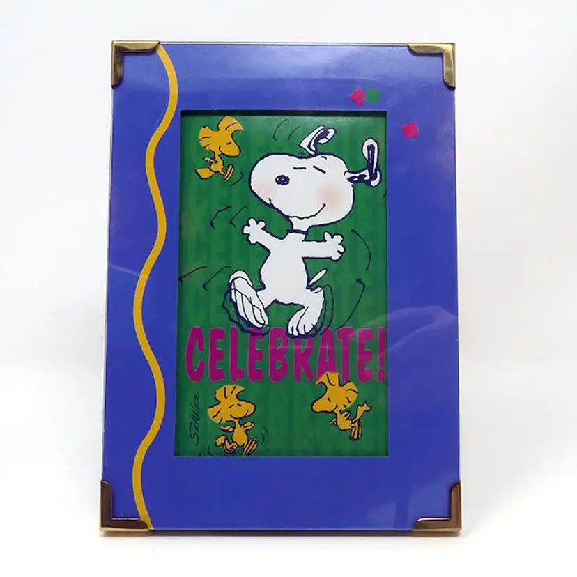 Brighten up your space with this cheerful Snoopy Celebrate! desk art. Featuring Snoopy and Woodstocks dancing joyfully, this desk art is perfect for any Peanuts fan. The vibrant blue frame with gold accents adds a fun touch to your decor. Made by Hallmark Peanuts Gallery. Comes with box.