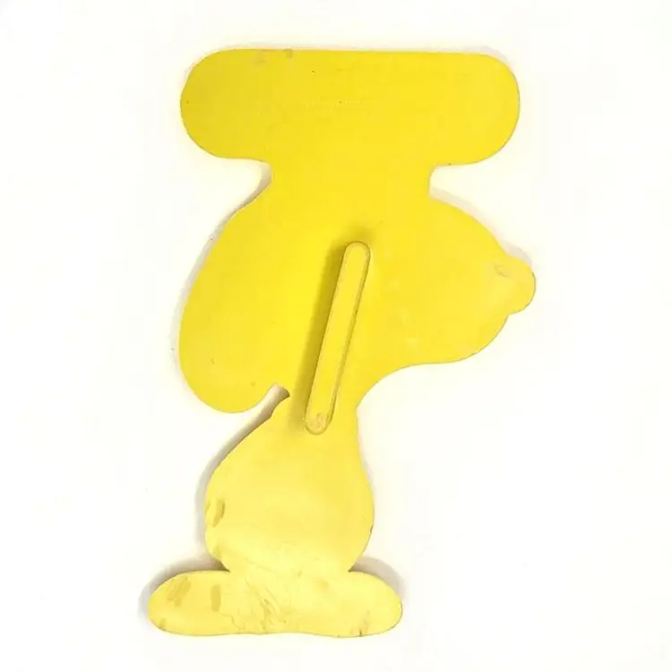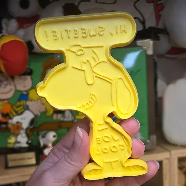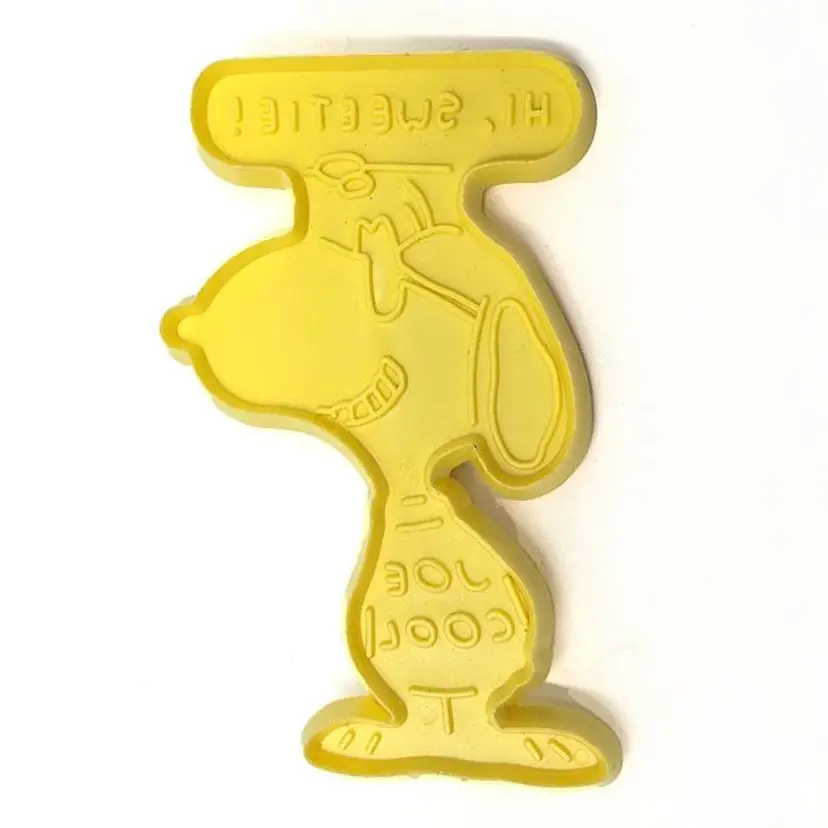 Bake some fun with this vintage Snoopy Joe Cool Cookie Cutter featuring the phrase 'Hi, Sweetie!' Perfect for Peanuts fans who love to bake, this yellow plastic cutter is shaped like Snoopy and adds a touch of nostalgia to your kitchen. Great for cookies! Shows signs of use. A delightful addition to any Peanuts collection. Made by Hallmark in the 1970s.