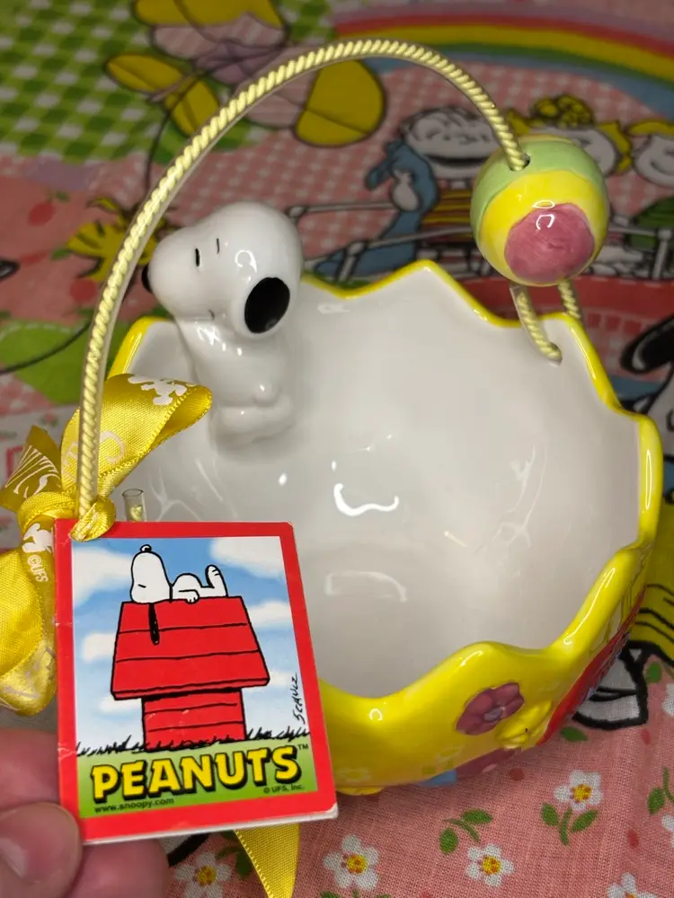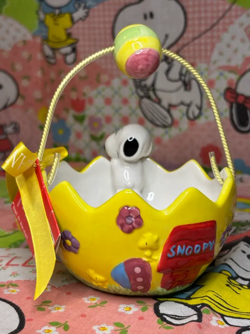 Snoopy is hanging over the edge of a yellow Easter egg candy dish. In excellent condition with no chips or cracks. Would make a great addition to any collection.