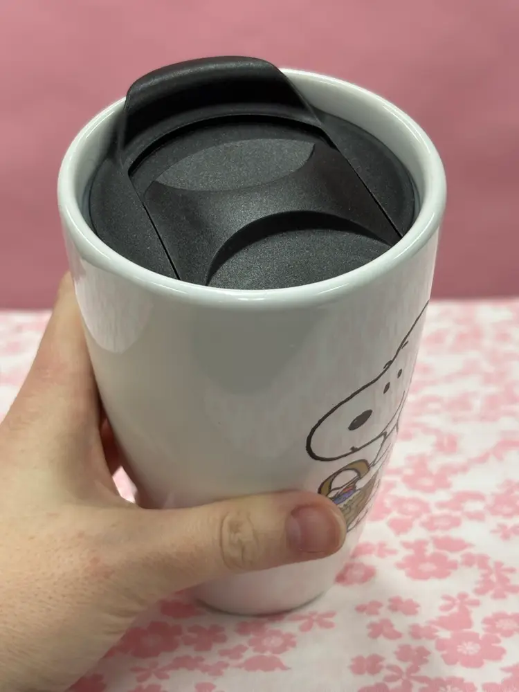 Super cute tumbler made of stoneware with a plastic lid. Approximately 6” tall. In excellent condition. Would be perfect for a cup of coffee or tea.