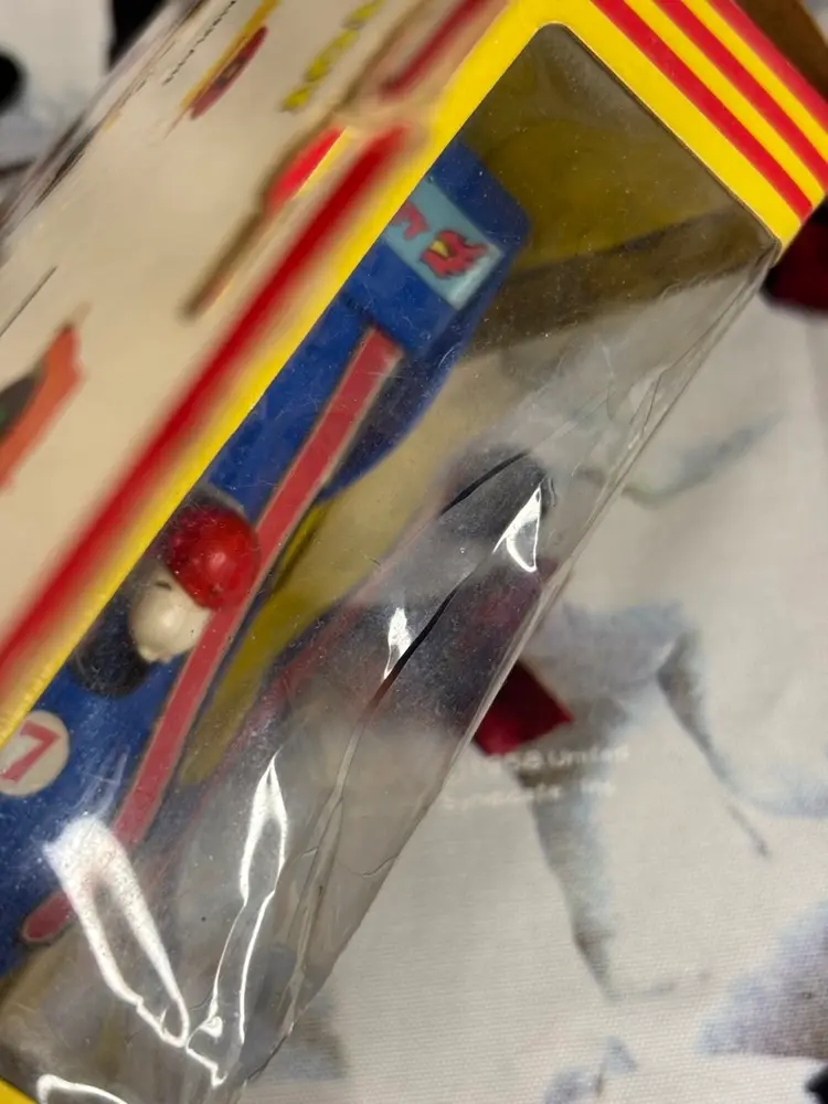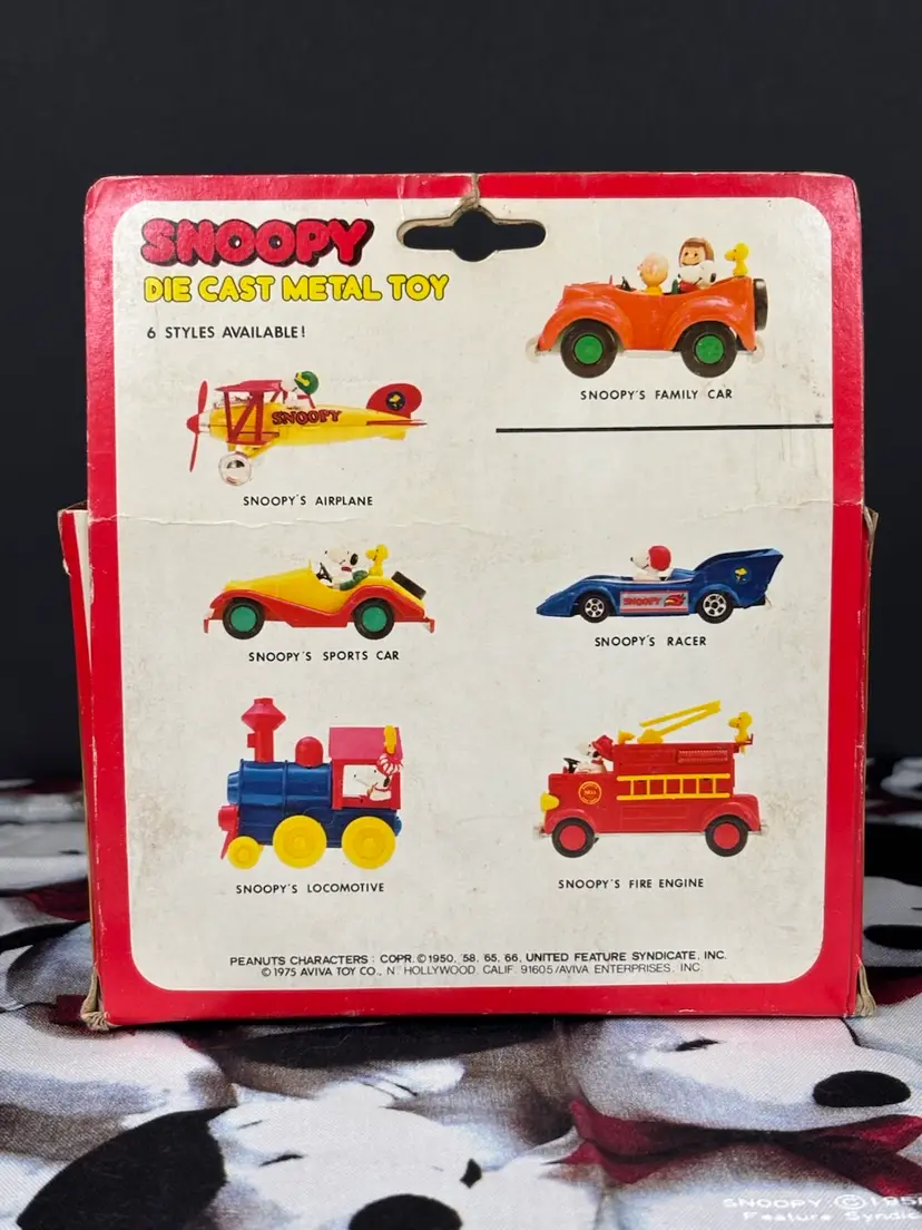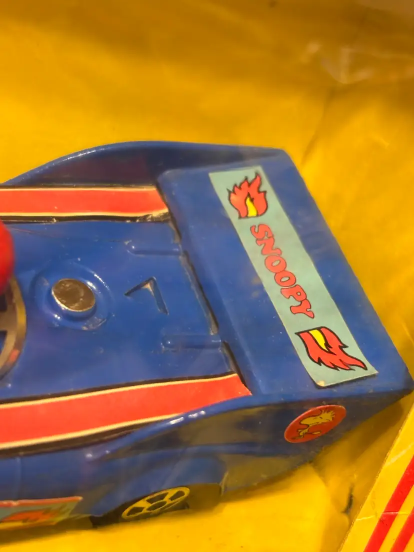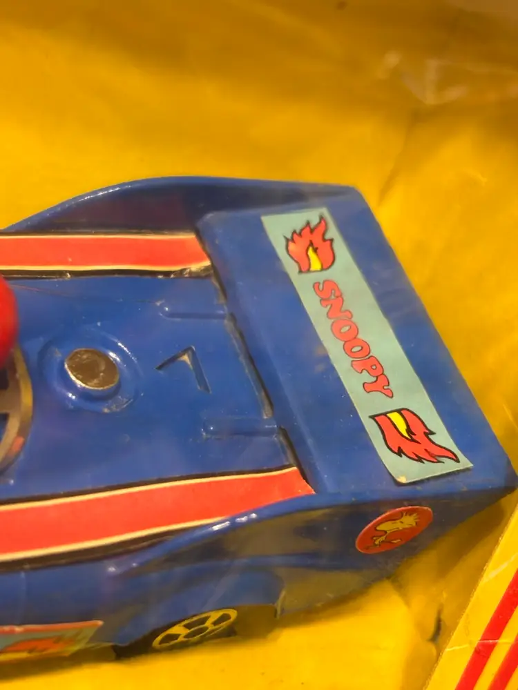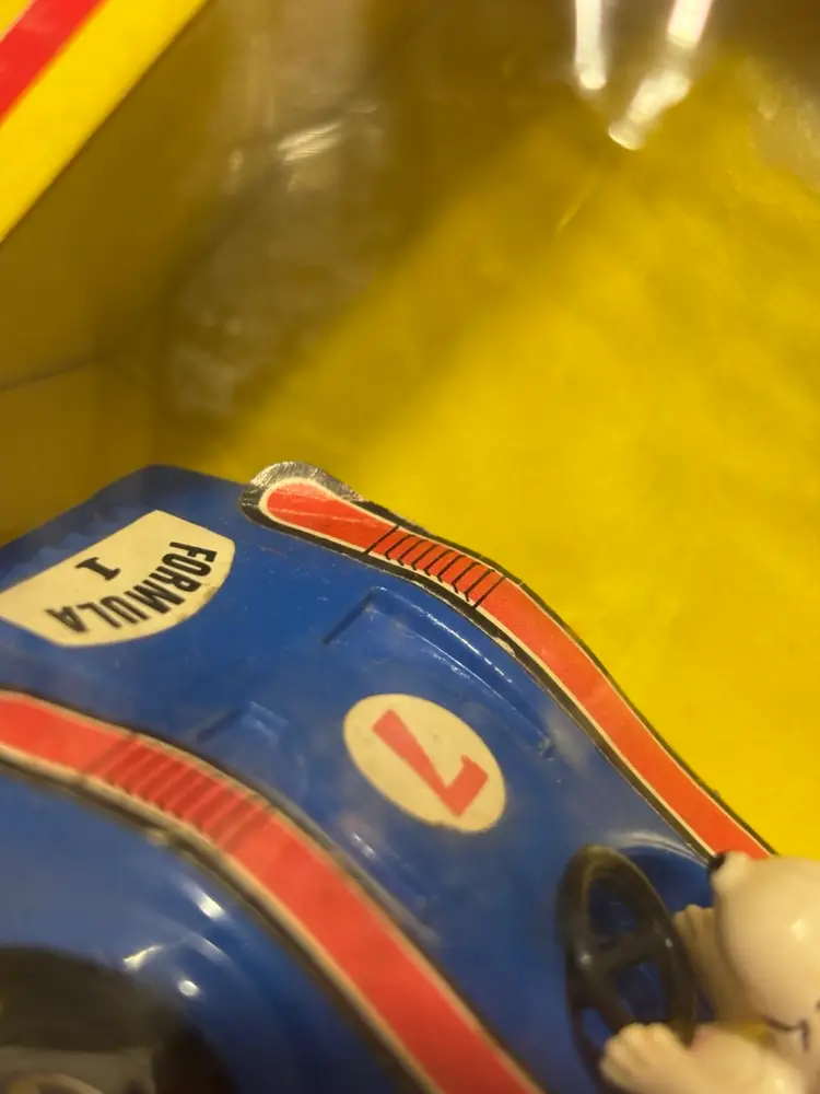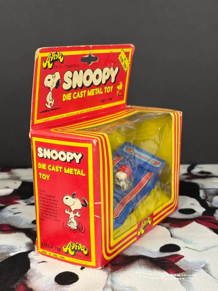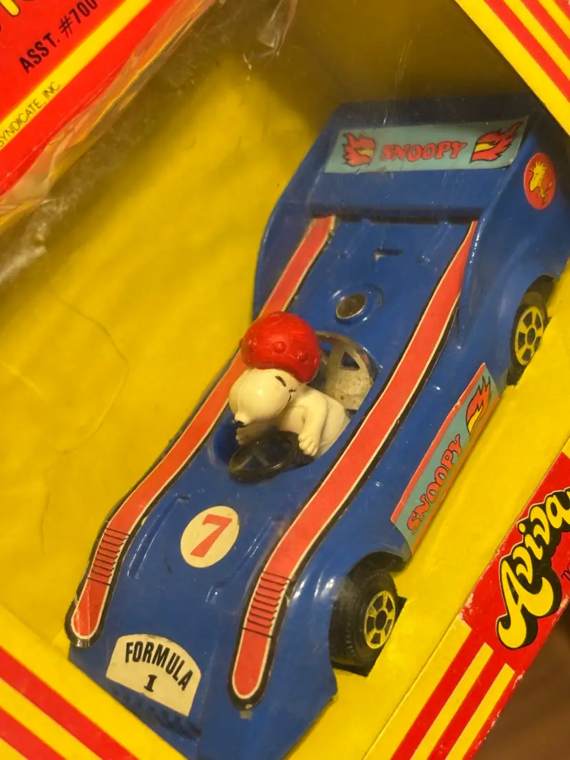 Who would be a better Formula One driver than Snoopy? Well, now’s your chance to have your very own version. New in box, though the box does have wear due to age and some cracks in the plastic as seen in the photos. The car inside is in good condition, but parts of the stickers have come loose as seen. Still, this is such a cool piece to have. Made by Aviva. Add it to your collection today!