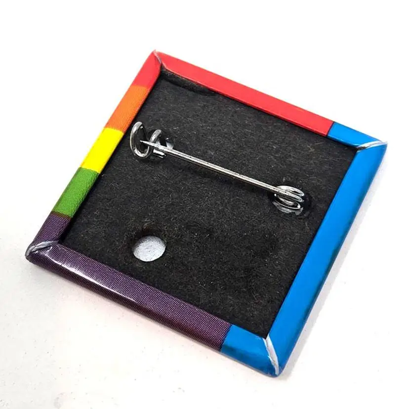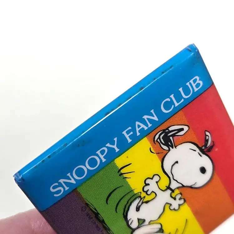 Brighten up your outfit with this cheerful Snoopy Fan Club Rainbow Pin. Featuring Snoopy dancing joyfully against a vibrant rainbow background, this pin from 1990is a must-have for any Peanuts enthusiast. Perfect for jackets and hats, it adds a splash of color and fun to your collection. In very good condition with some slight discoloration on the edge.
