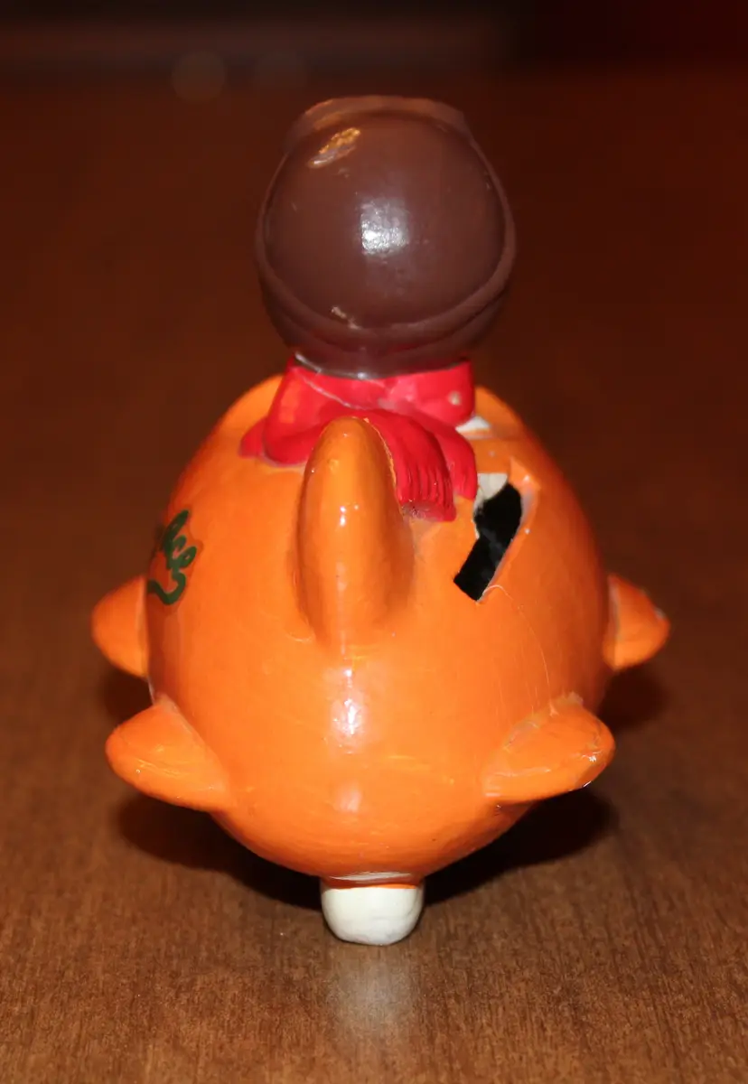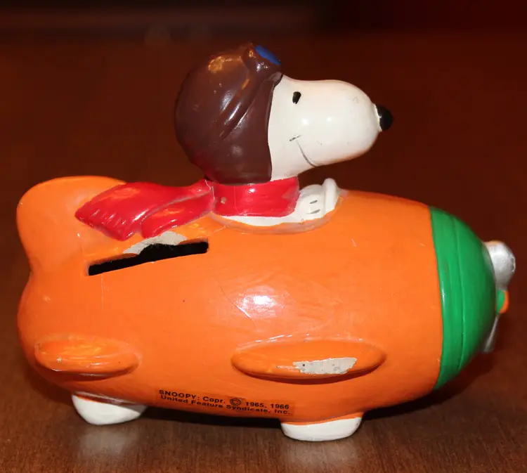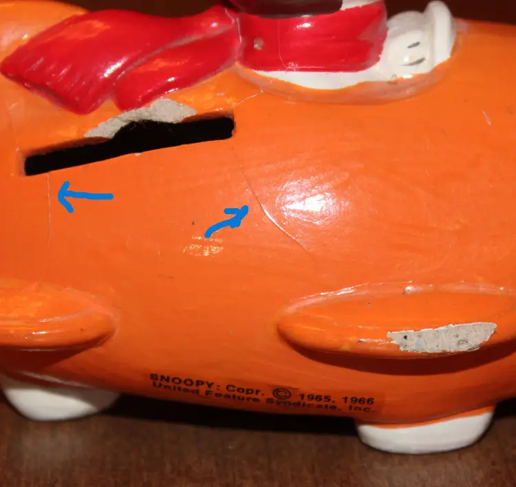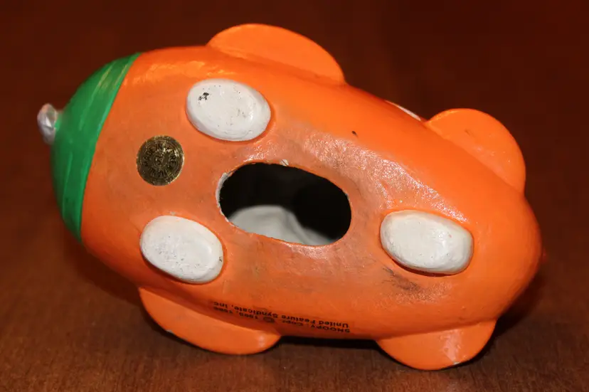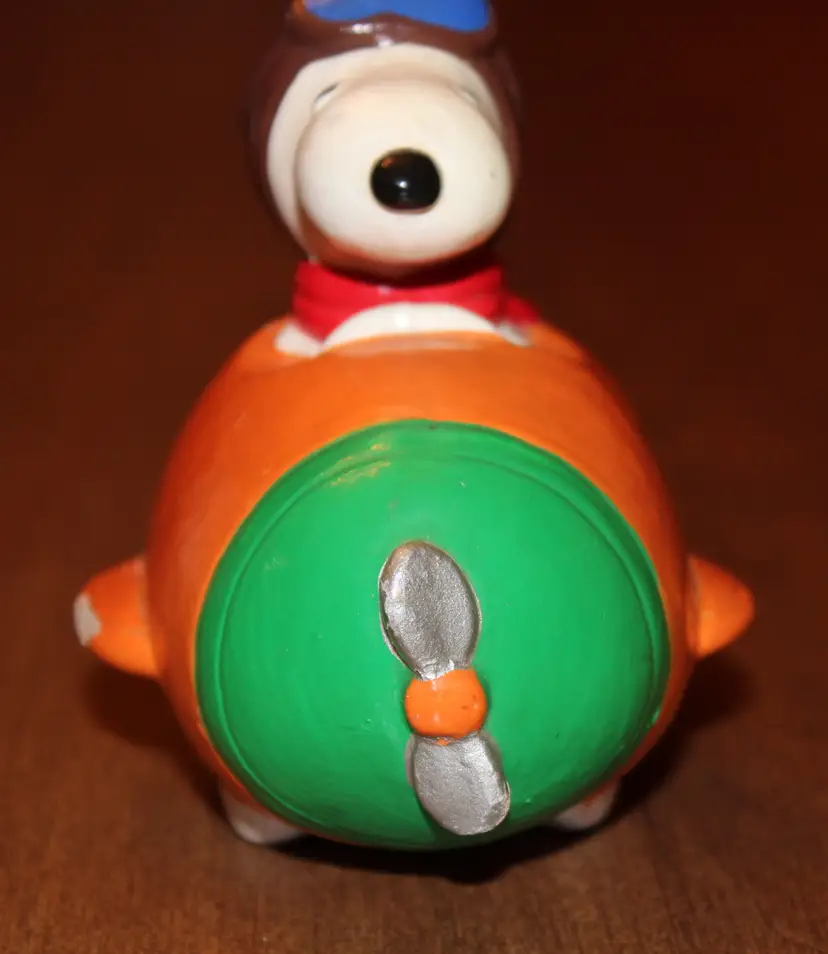 Snoopy as the Flying Ace in an orange plane. Nice banner with Flying Ace and his bright red scarf. Made of papier mache. Has two nicks that can be seen in the second photo. Has two hairline cracks which are marked with blue arrows in photo. No stopper on bottom. It's been in my collection in that condition since the early 90's. No repairs. Chose not to try to touch it up. Nice collector's item as is.