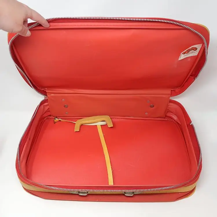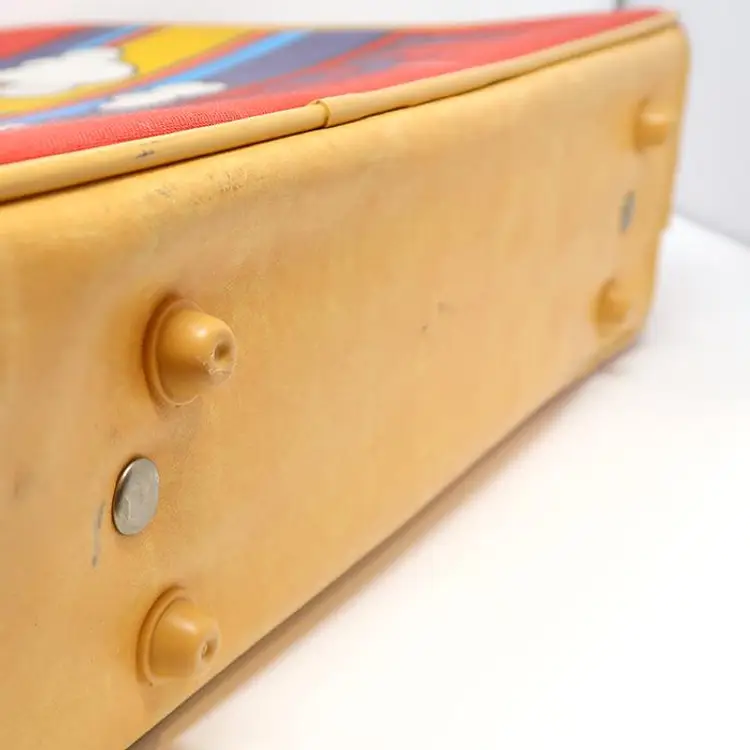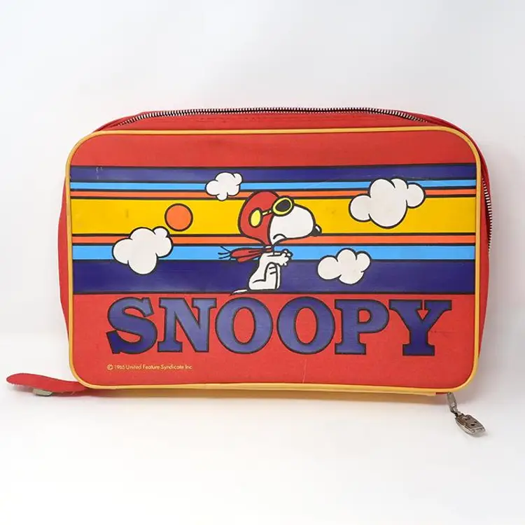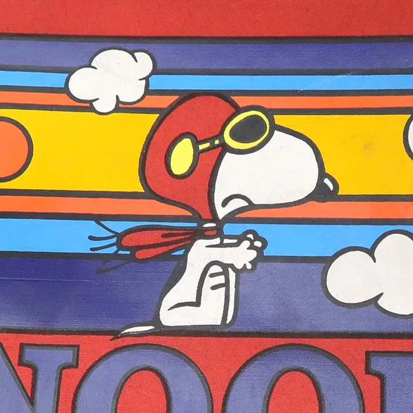 Bring adventure to your space with this vibrant Snoopy Flying Ace suitcase. Featuring Snoopy in his iconic aviator gear against a colorful backdrop, it's a must-have for any Peanuts fan. This child's size suitcase was made in the 1970s by Aviva. The handle is broken, but is in very good used condition otherwise and still has its feet. No key for the lock.