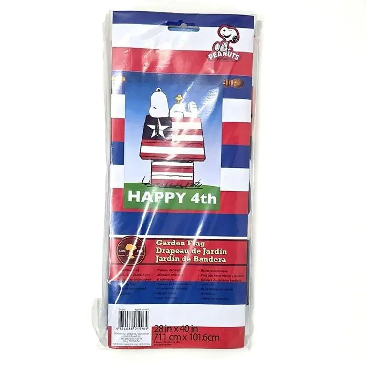 Celebrate Independence Day with this vibrant Snoopy Happy 4th Garden Flag. Featuring Snoopy in patriotic red, white, and blue, it's perfect for adding Peanuts charm to your outdoor decor. Ideal for fans looking to showcase their love for Snoopy and the USA. Unused in original package. Size: 28" x 40".