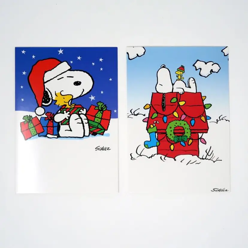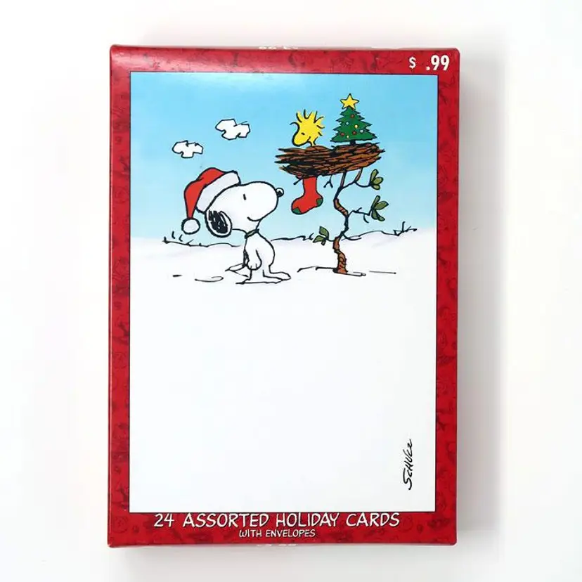 Spread holiday cheer with this delightful set of 24 assorted Snoopy Holiday Cards. Featuring Snoopy in a festive Santa hat and Woodstock decorating a tree, these cards are perfect for any Peanuts fan. Each card comes with an envelope, making it easy to share the joy of the season.