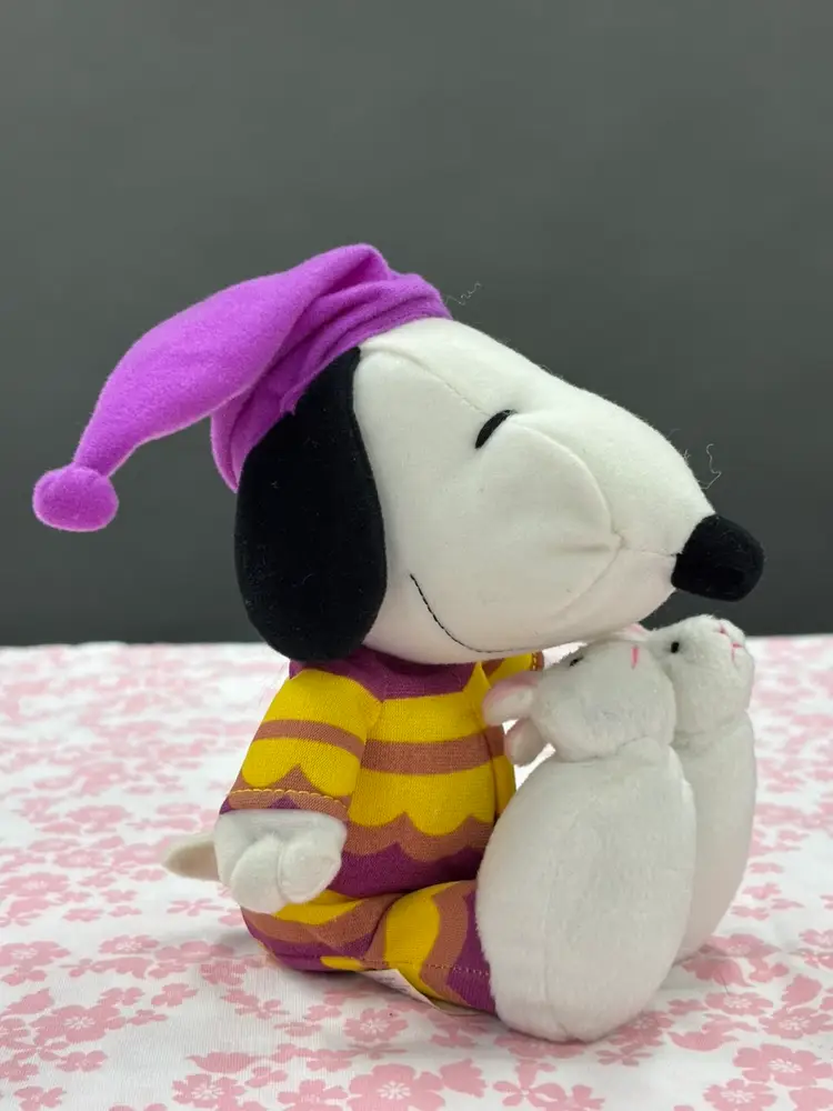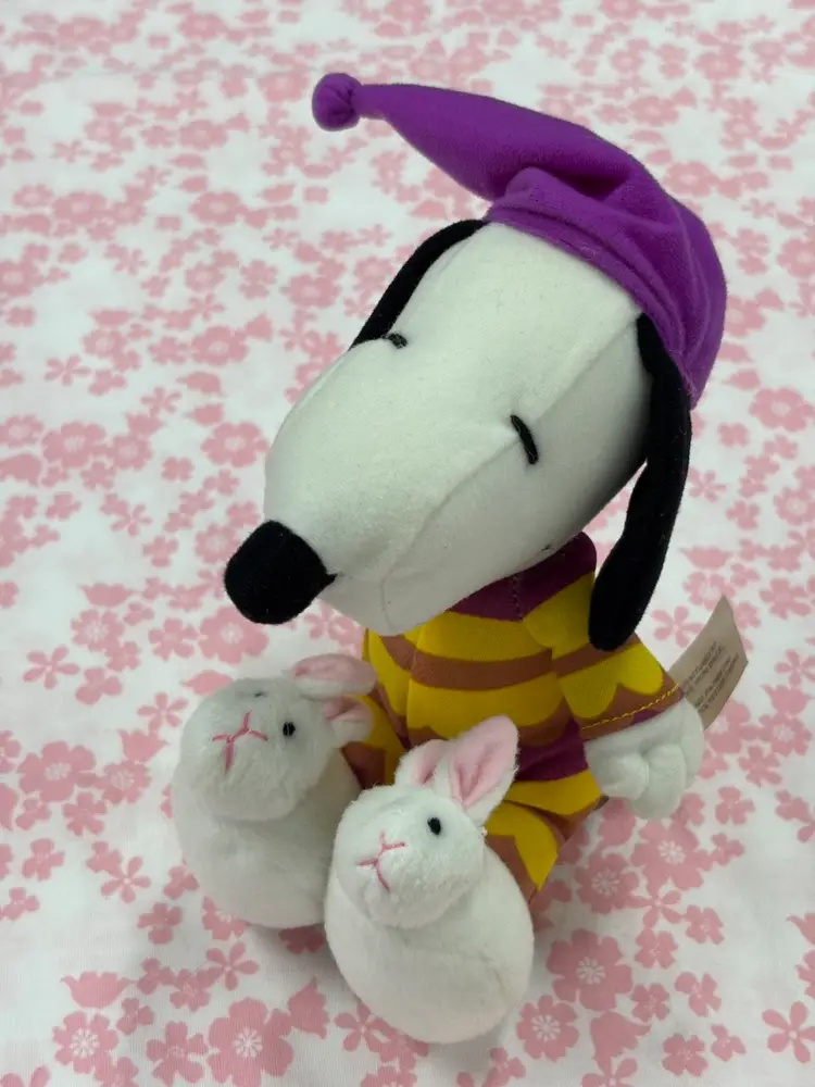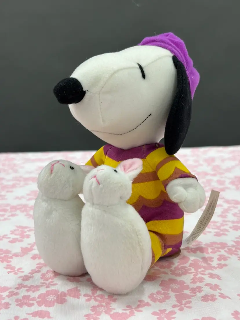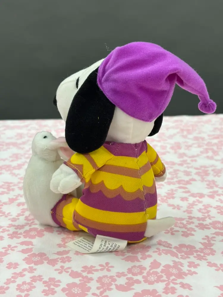 Vintage Snoopy plush made by The Marketing Store Worldwide for Whitmans. This one is wearing yellow Easter egg patterned pajamas and the cutest bunny slippers. Approximately 6 inches tall when sitting. Would be a super cute addition to any collection!