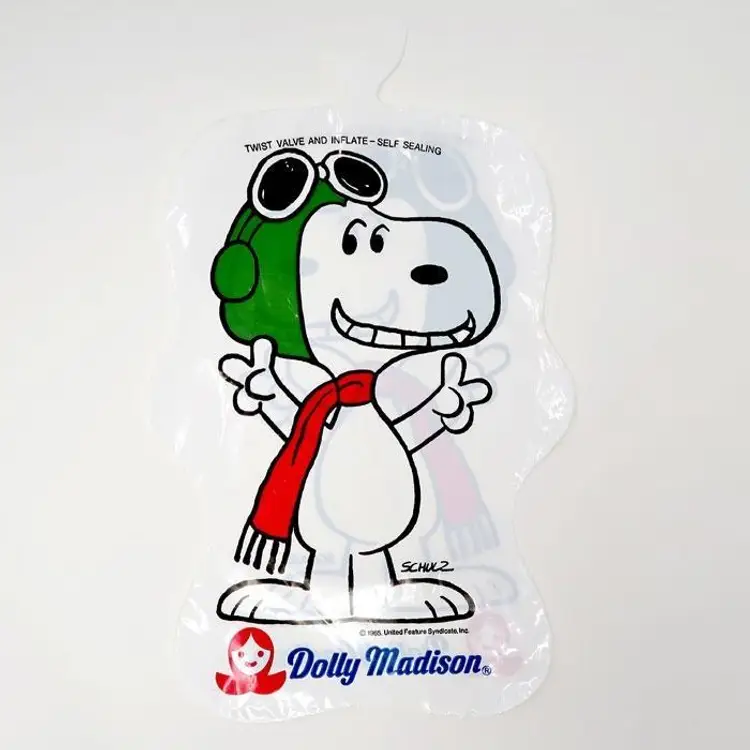 Bring Snoopy's adventurous spirit to life with this vintage Flying Ace inflatable from Dolly Madison. Featuring Snoopy in his iconic aviator gear, this collectible is perfect for any Peanuts fan. Self-sealing and easy to inflate, it's a fun addition to your Peanuts collection. In great condition with vibrant colors. In unused condition with minor shelf wear and is about 10" tall. Not guaranteed to work.