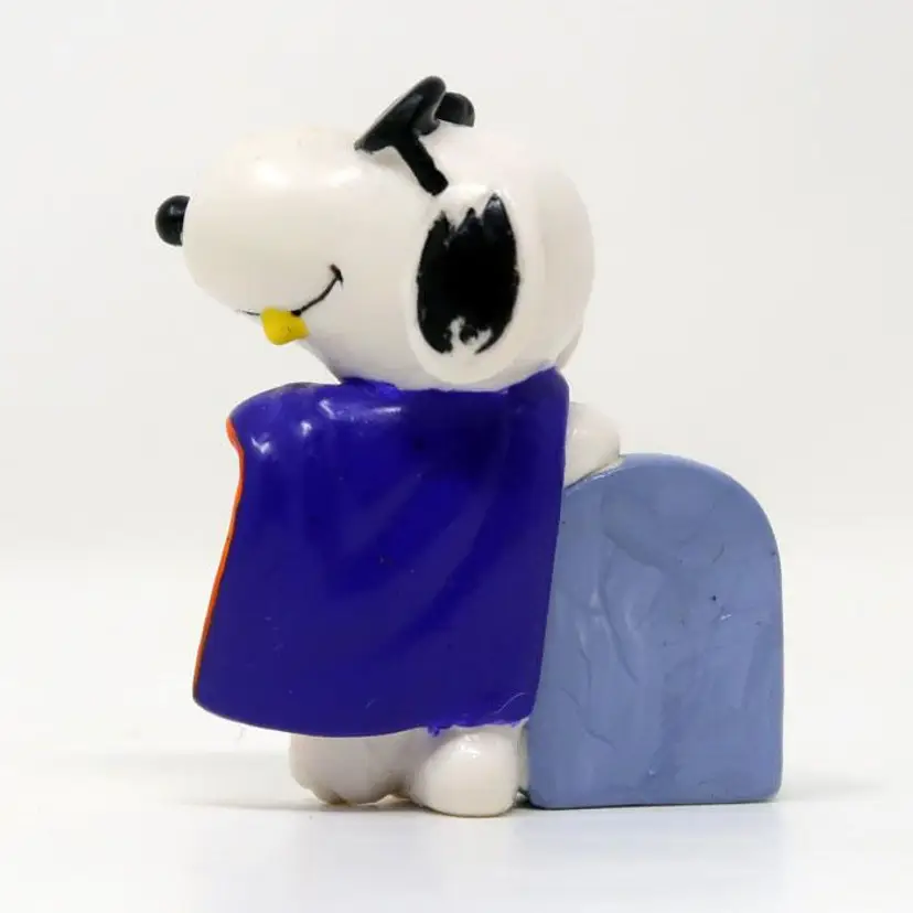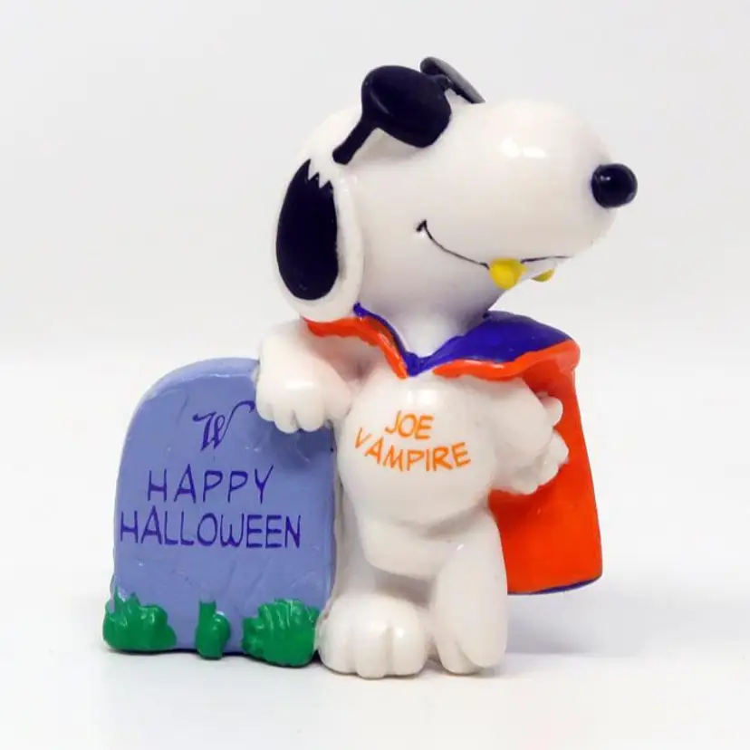 Celebrate Halloween with this charming Snoopy 'Joe Vampire' Figurine. Dressed in a spooky vampire cape and fangs, Snoopy leans against a tombstone that reads 'Happy Halloween.' Perfect for adding a touch of Peanuts fun to your holiday decor. A great addition for any Peanuts fan's Halloween collection! Made by Whitman's Chocolates and shows some signs of age and use.