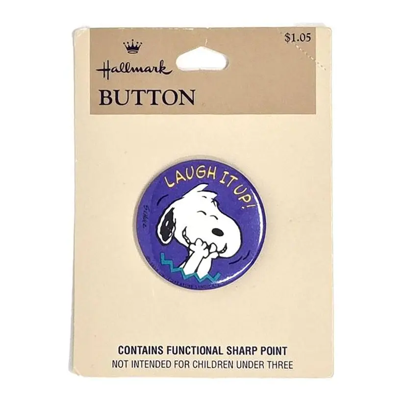 Add a touch of humor to your collection with this Snoopy 'Laugh It Up!' Button. Featuring Snoopy in a giggling pose, this vintage 1990s Hallmark button is perfect for any Peanuts fan. Still on its original card, it's a great nostalgic piece to display or wear. Package and button show some minor shelf wear. About 1.5" in diameter.