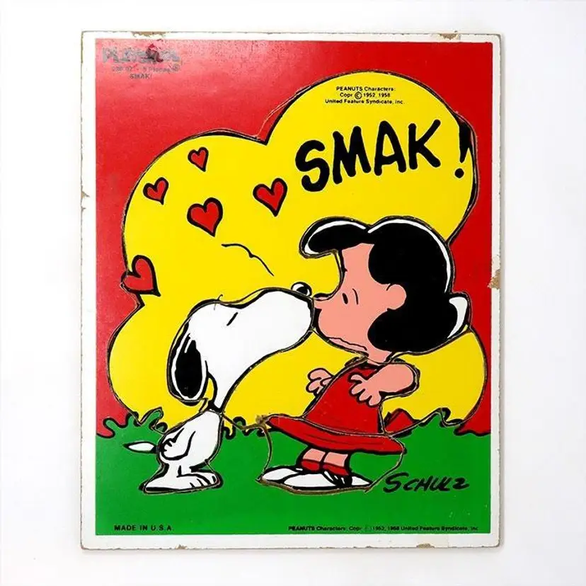 Add a touch of Peanuts charm to your space with this vintage Snoopy & Lucy 'SMAK!' Board Puzzle. Featuring Snoopy giving Lucy a sweet kiss, this colorful piece is perfect for fans of the classic comic strip. Made in the USA by Playskool in 1979, it's a delightful addition to any Peanuts collection.