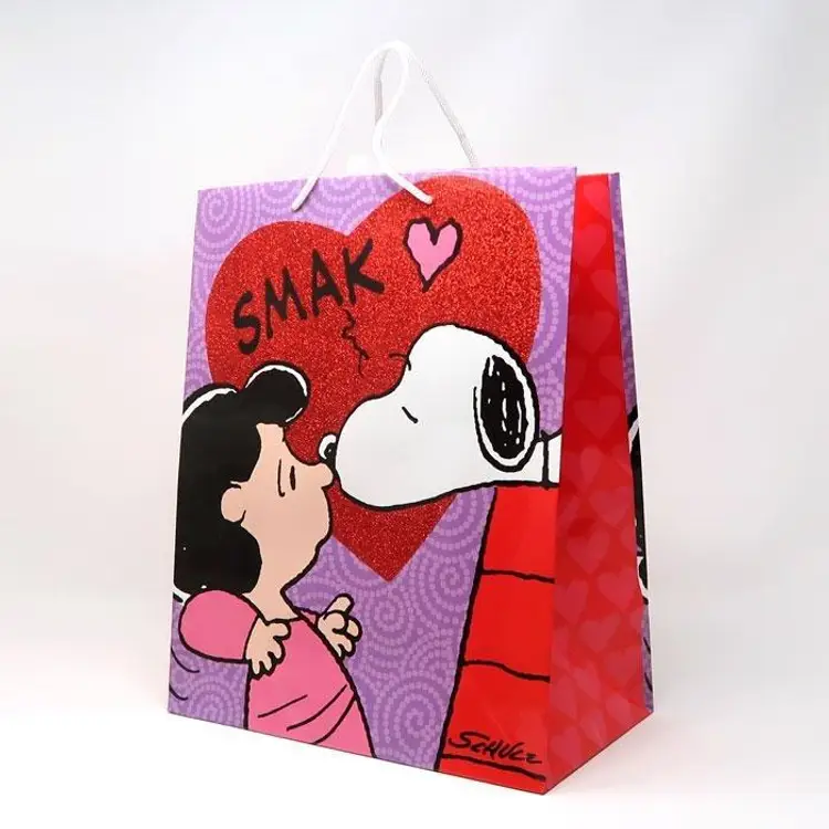 Share the love with this adorable Snoopy & Lucy Valentine's Gift Bag. Featuring a sweet 'SMAK' kiss design, it's perfect for wrapping up special gifts for your favorite Peanuts fan. The vibrant colors and charming artwork make it a delightful addition to any celebration. Produced by Hallmark and is about 10″ x 13″ x 5″.