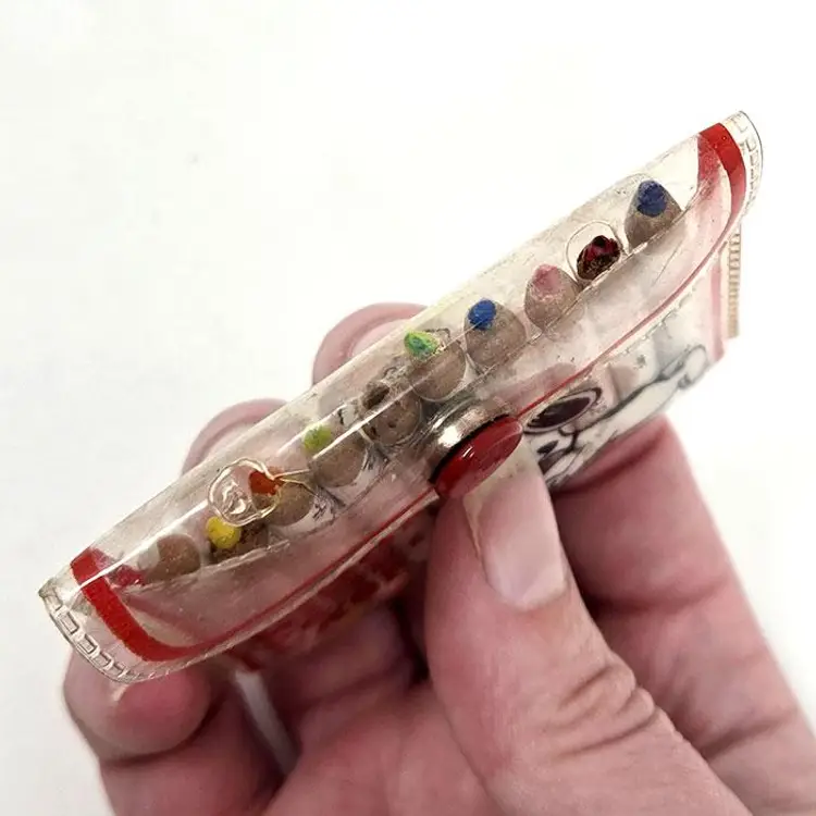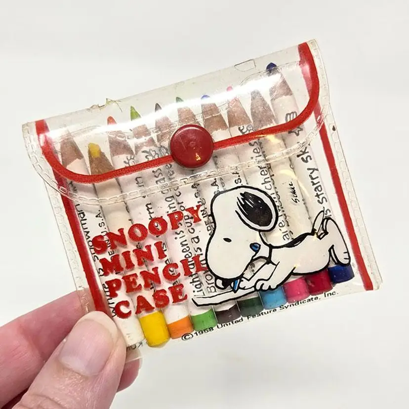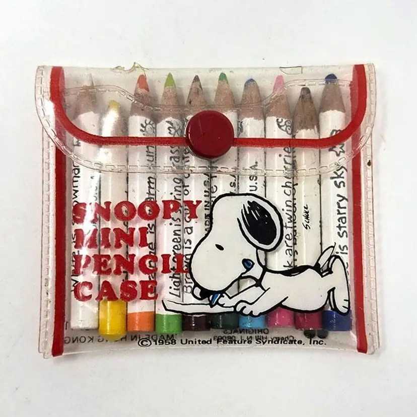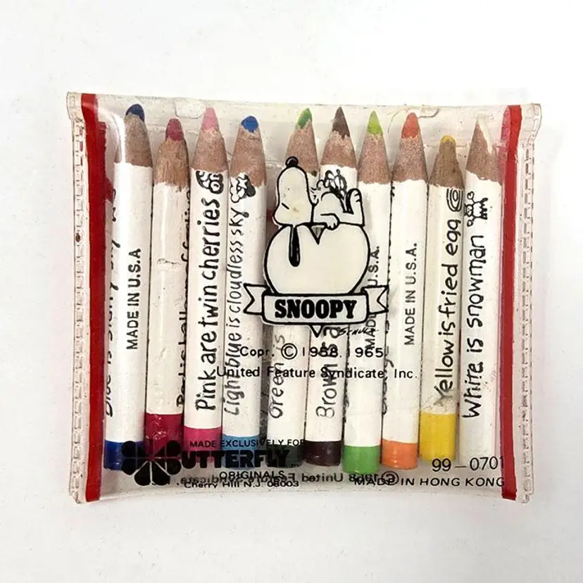 Keep your colored pencils organized with this adorable Snoopy Mini Pencil Case. Featuring a cute Snoopy design, this case includes a set of 10 mini colored pencils. A great addition to any Peanuts comic strip fan's collection. Made by Butterfly Originals in the 1980s. Case is missing the handle, shows some signs of use, plus pencils are slightly used.