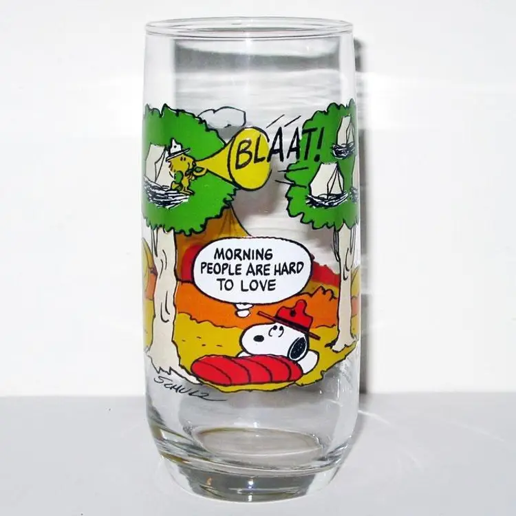 Start your day with a smile using this Snoopy 'Morning People Are Hard to Love' glass tumbler. Featuring a classic comic strip scene with Snoopy and Woodstock, it's perfect for any Peanuts fan. Great for your morning juice or as a collectible display piece. In excellent condition. Released by McDonald's in 1983.