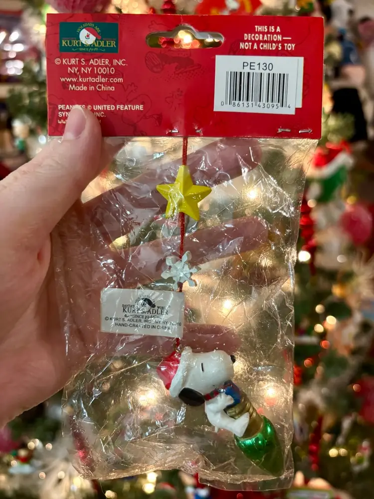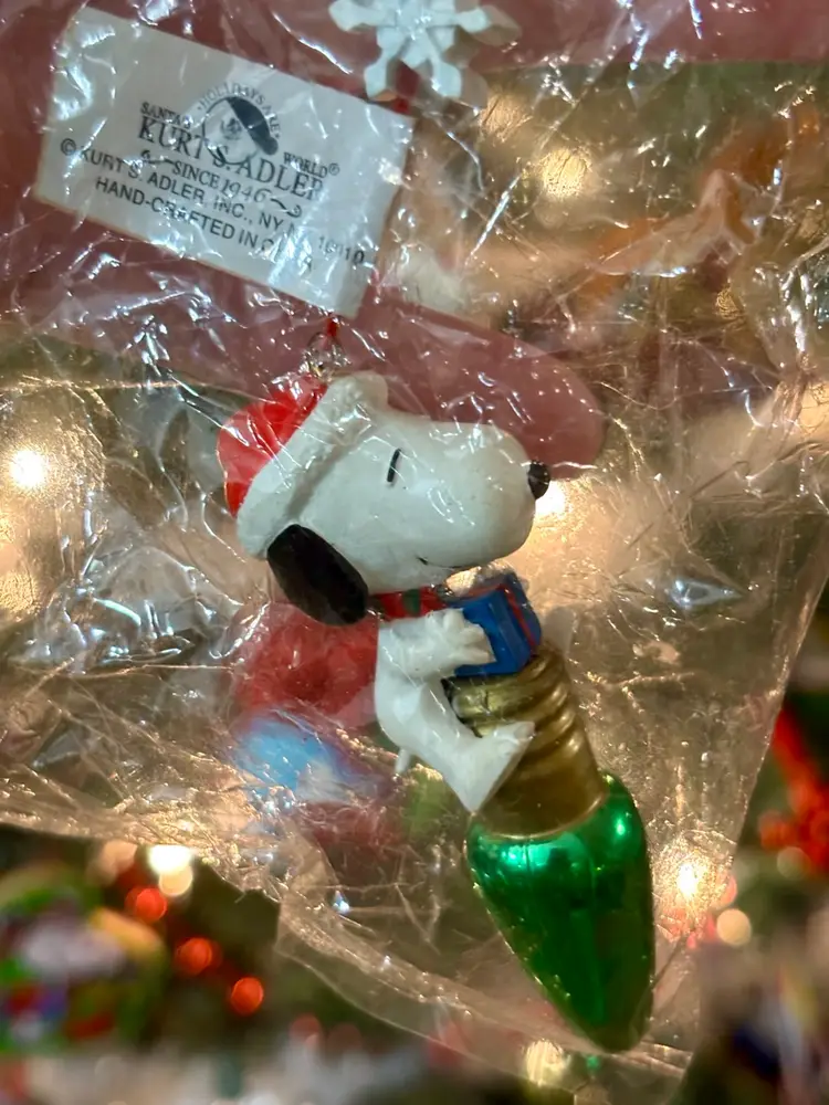 This is a super cute Snoopy ornament from Kurt Adler. Snoopy is sitting atop a green Christmas light bulb. New in package.
