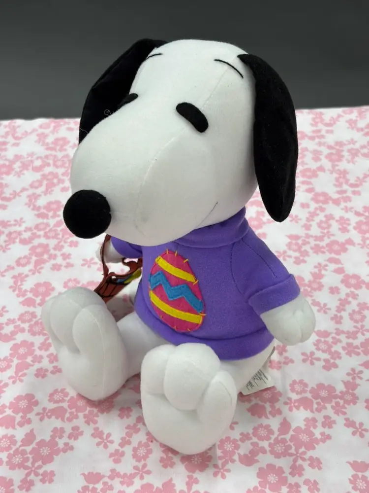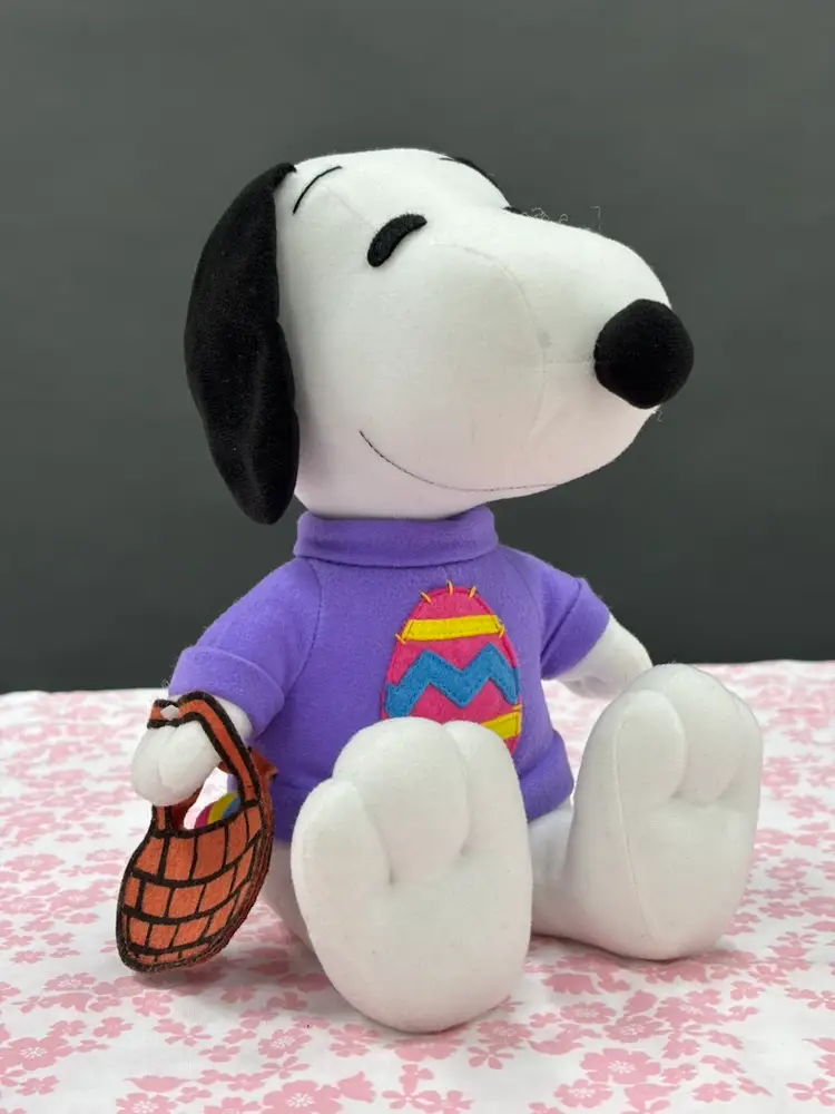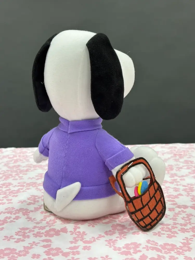 Larger Snoopy plush made by Determined Productions. This one is wearing a purple shirt with an Easter egg on it and is holding an Easter basket. Just under 9 inches when sitting. Would be a super cute addition to any collection!