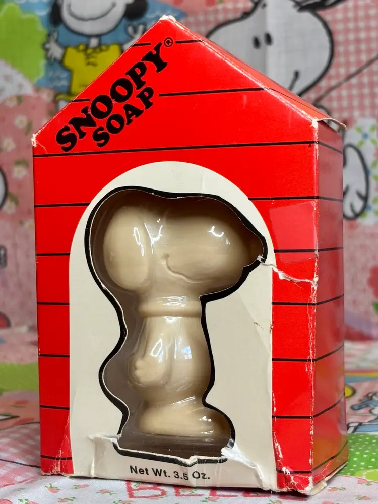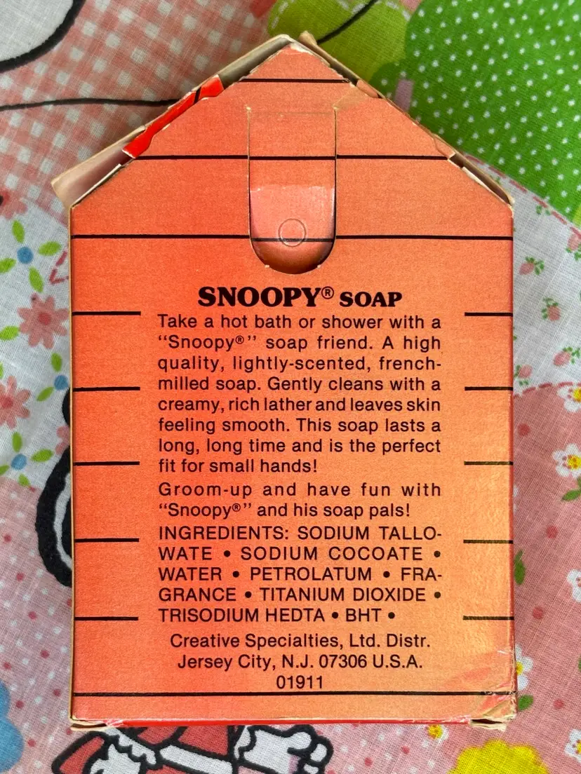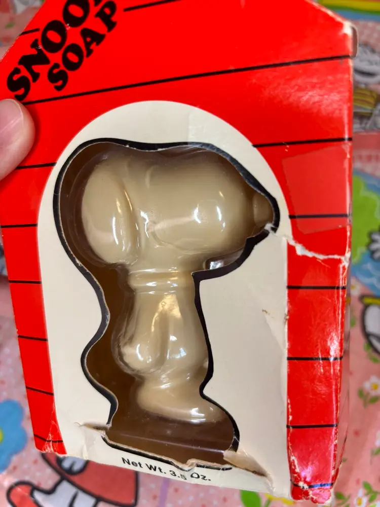 This Snoopy-shaped soap is in box designed to look like his doghouse. It was made by Creative Specialties. The box is around 6.5” tall. Box has some wear and the back is faded, as seen in the pics. The soap inside looks to be in perfect condition.
