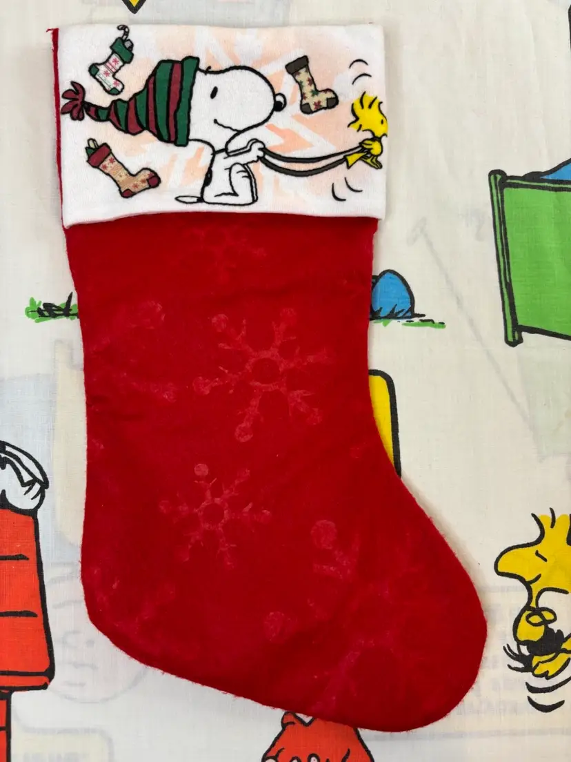 This fun stocking was made by Ruz in 2018. Features Snoopy driving his “reindeer” Woodstock. New, with cardboard still inside. No tags. Add this super cute stocking to your collection today!