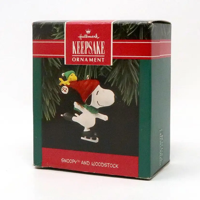 Celebrate the holiday season with this delightful Snoopy and Woodstock ice skating ornament from Hallmark in 1992. Featuring Snoopy in a festive red hat and green scarf, and Woodstock joyfully perched on top, this charming piece is perfect for any Peanuts fan's Christmas tree. A nostalgic addition to your collection! In very good condition with some signs of use and shelfwear on box.