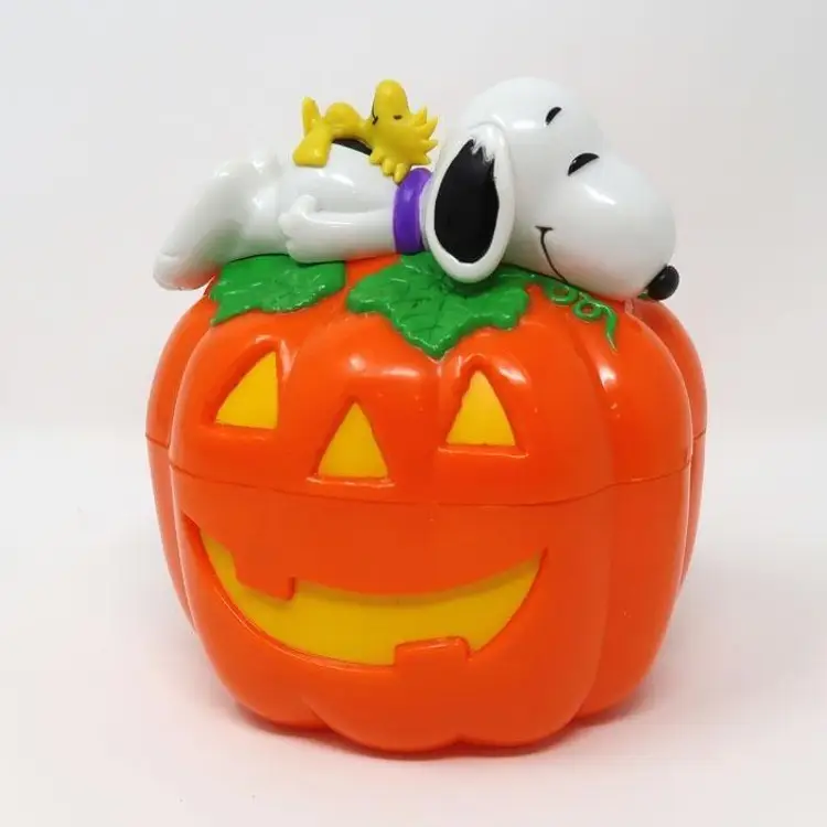 Celebrate Halloween with this charming Snoopy & Woodstock Pumpkin Candy Container and Bank. Featuring Snoopy and Woodstock lounging on a bright orange jack-o'-lantern, it's perfect for storing treats or adding festive flair to your Peanuts collection. A must-have for any Peanuts fan during the spooky season! Shows some signs of age.