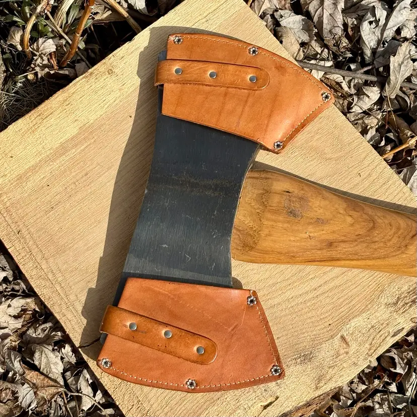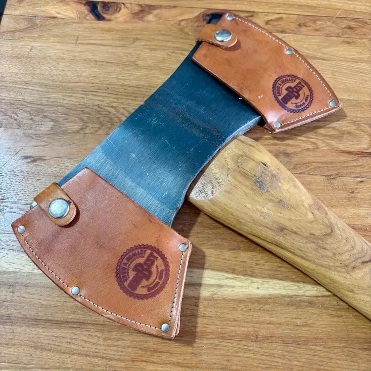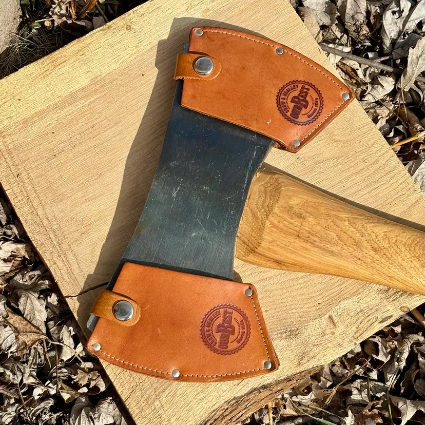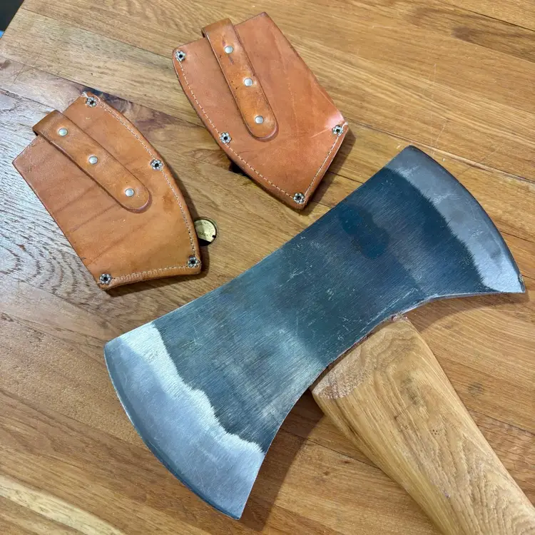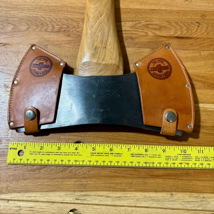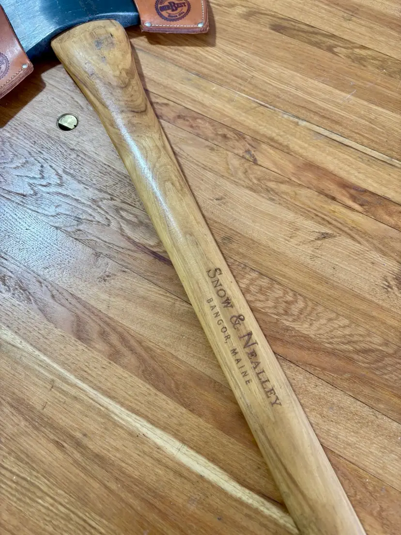 Beautiful Snow & Nealley "Our Best" Double Bit Axe. Appears to have never been used. Measures 36" in length from handle to head and weighs approximately 83 ounces total. Each side of the blade has a sturdy leather sheath with snap closure and embossed with S&N markings. The only markings on the axe head are a "SN" stamped into the bottom edge as shown in the last picture. The handle is also embossed with Snow & Nealley Bangor Maine. I originally purchased this at an auction to have as a cool feature mounted on the wall in my shop, but have decided it would be better in the hands of a collector or someone that could put it to work. Price is negotiable, so send me a reasonable offer to start the conversation. Obviously, it will be cumbersome to package and heavy to ship, thus the shipping charge.