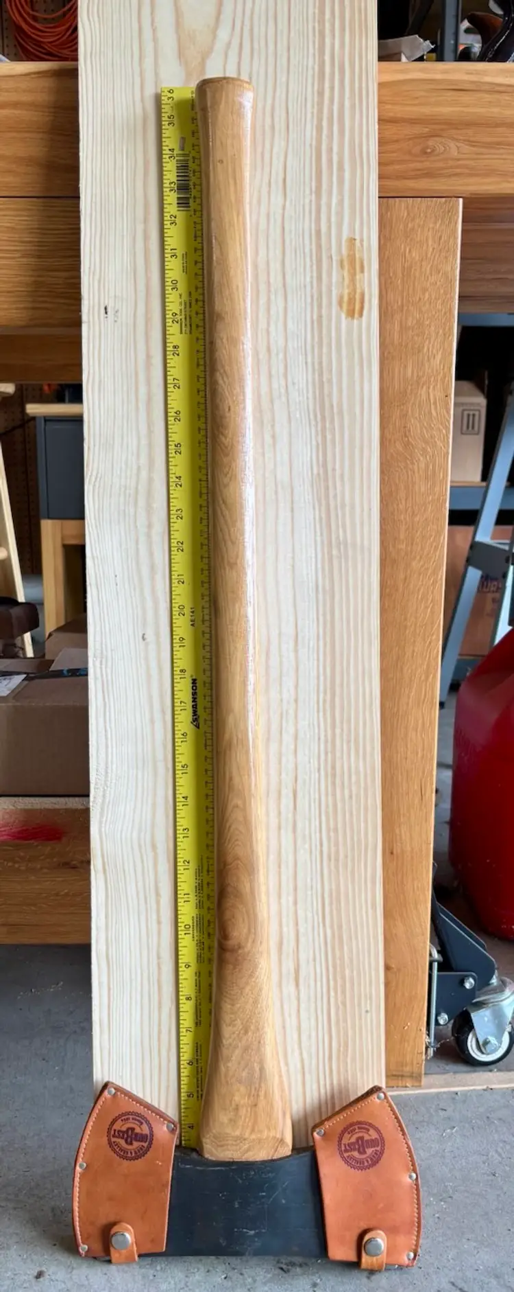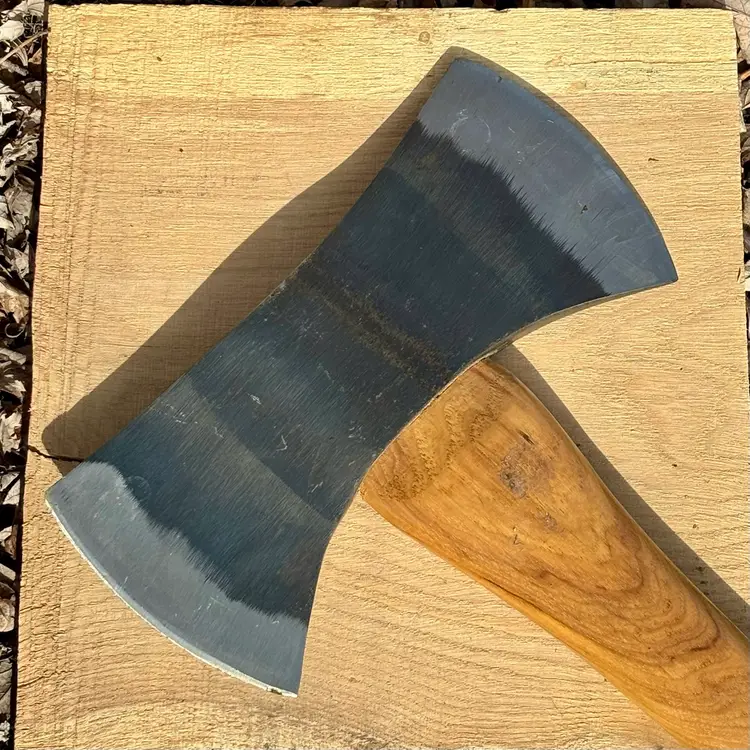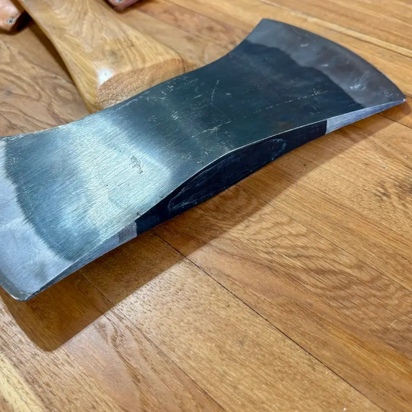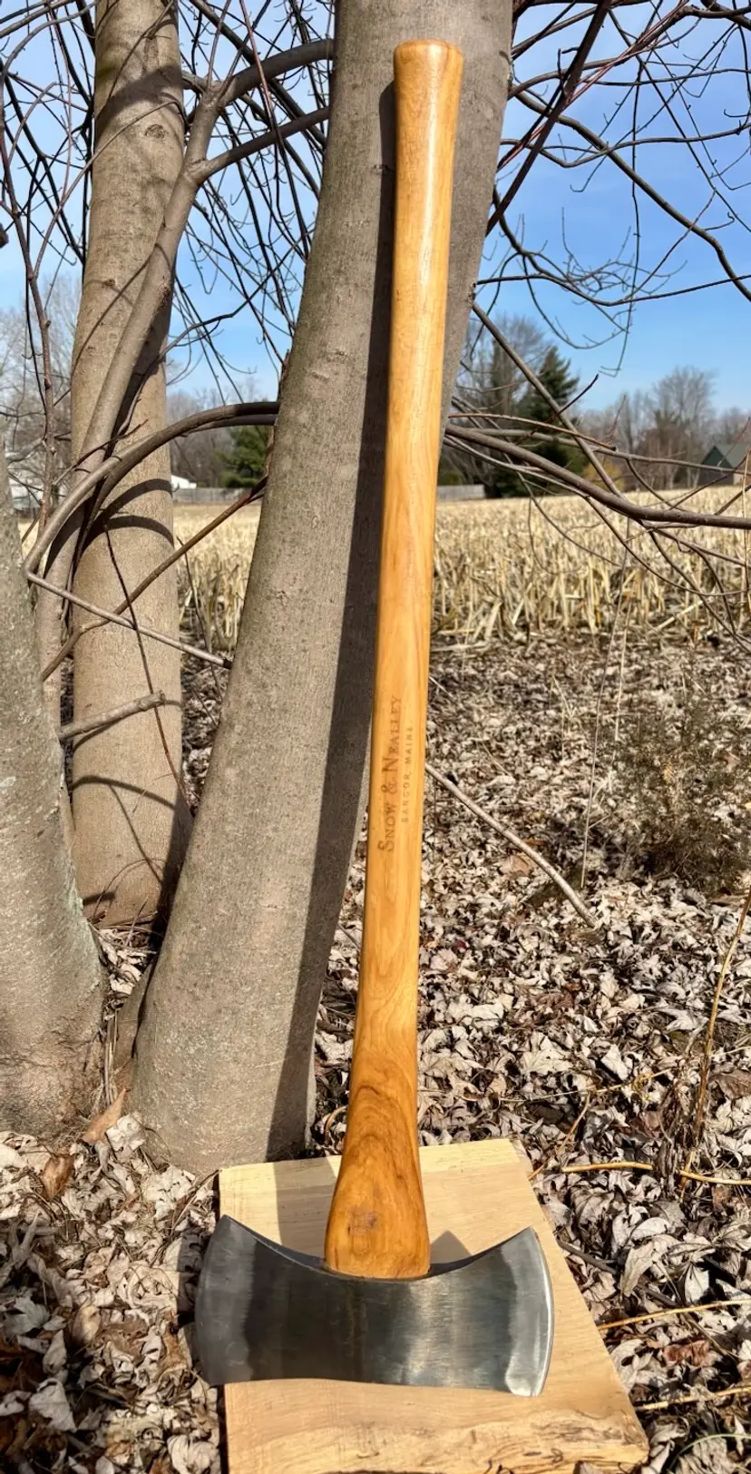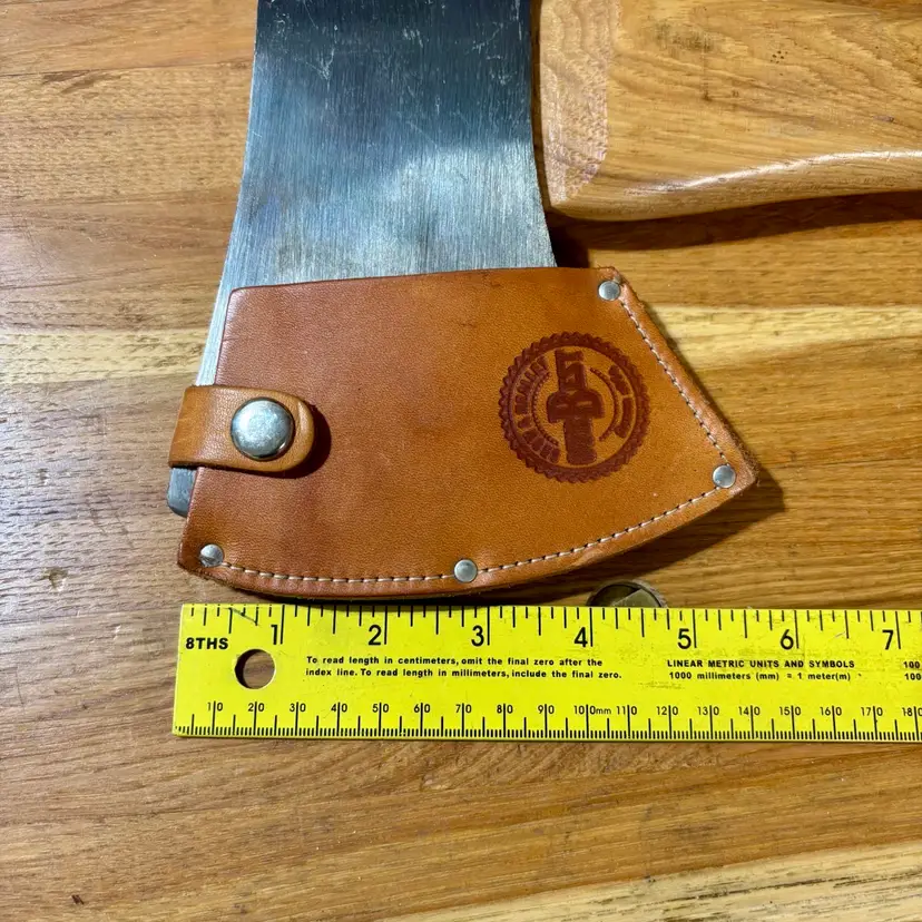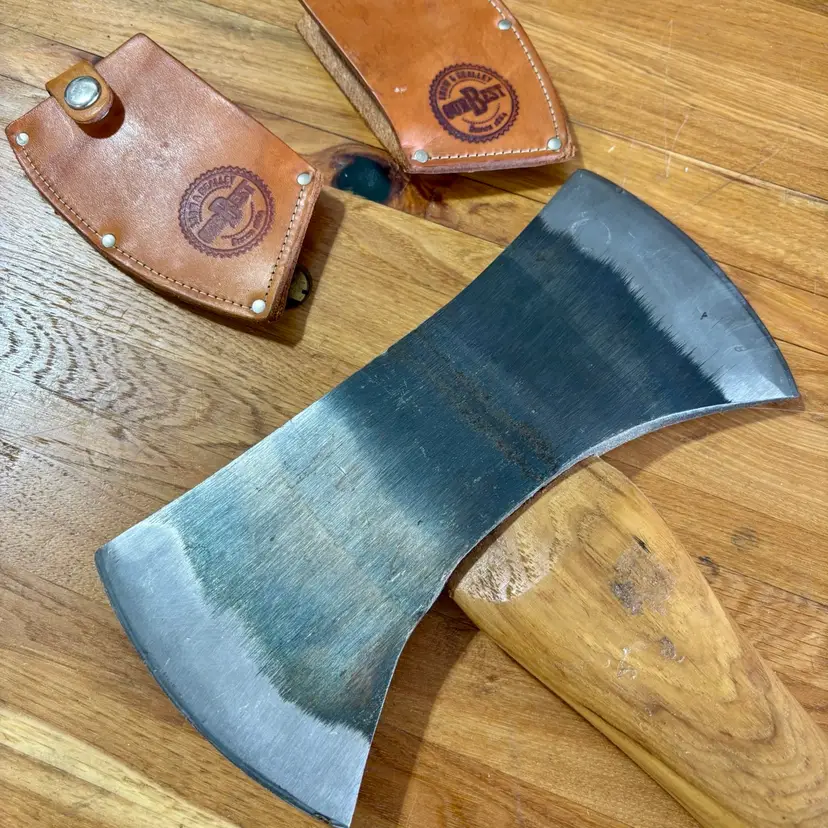 Beautiful Snow & Nealley "Our Best" Double Bit Axe. Appears to have never been used. Measures 36" in length from handle to head and weighs approximately 83 ounces total. Each side of the blade has a sturdy leather sheath with snap closure and embossed with S&N markings. The only markings on the axe head are a "SN" stamped into the bottom edge as shown in the last picture. The handle is also embossed with Snow & Nealley Bangor Maine. I originally purchased this at an auction to have as a cool feature mounted on the wall in my shop, but have decided it would be better in the hands of a collector or someone that could put it to work. Price is negotiable, so send me a reasonable offer to start the conversation. Obviously, it will be cumbersome to package and heavy to ship, thus the shipping charge.