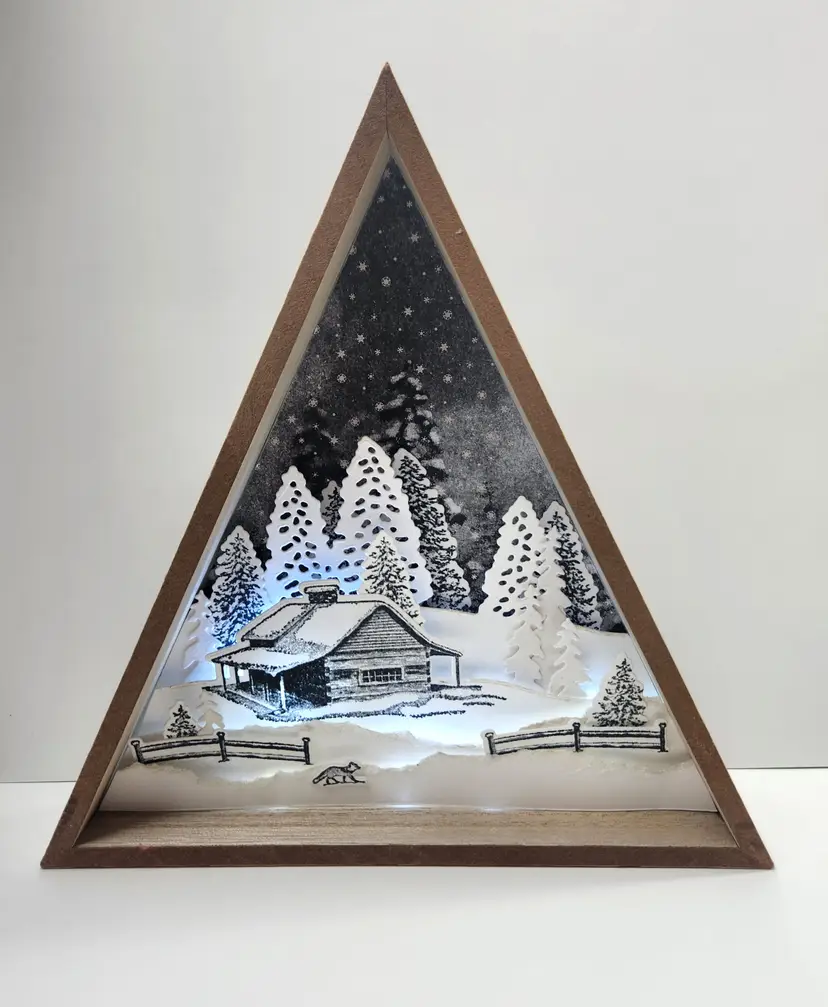 Triangle-shaped shadow box filled with stamped and die cut layers of cardstock. Made live during Art Hangout Train.