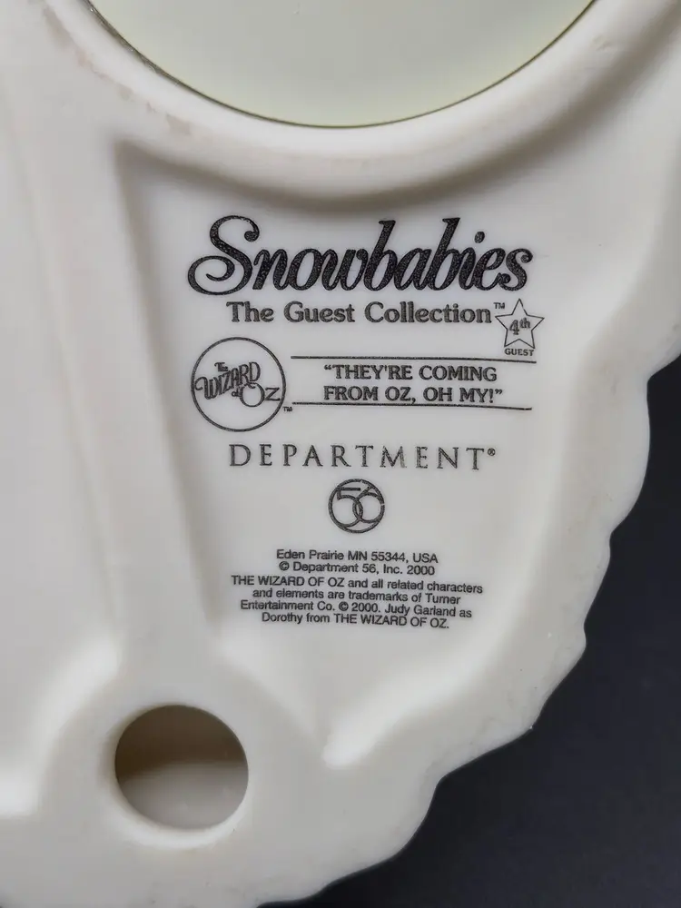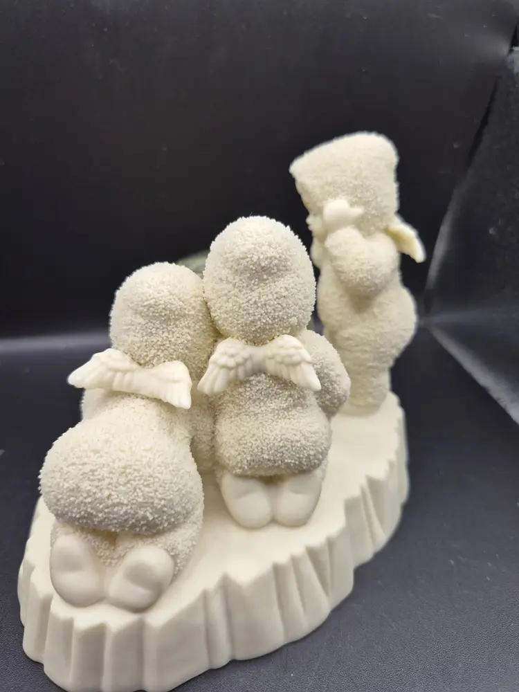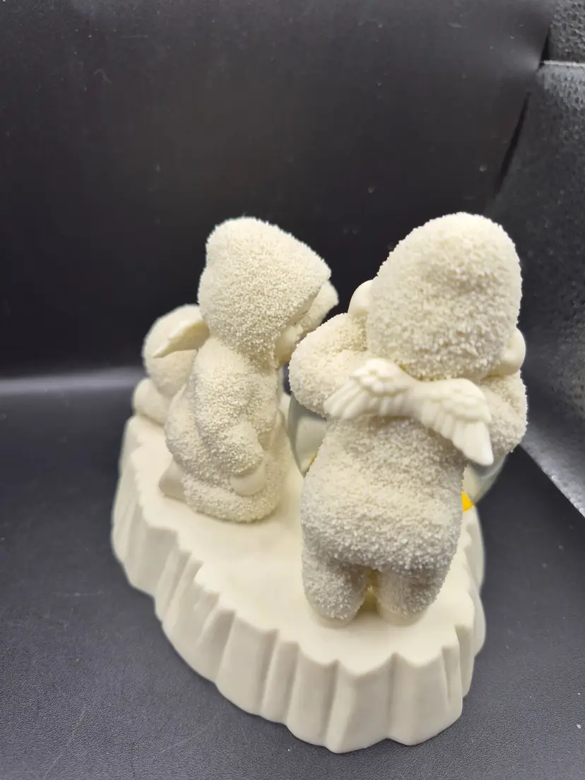 Three cherubic angels encircle a snow globe that captures the magic of the Wizard of Oz. Their soft, textured white robes and delicate wings create a nostalgic charm, while the globe features Dorothy, Toto, and friends on the yellow brick road. A whimsical addition to any collection.