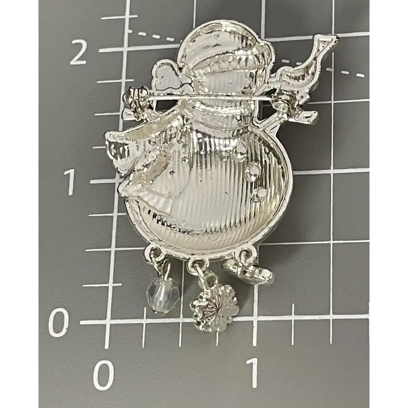 This is a GLITTERED SNOWMAN SILVER TONE BROOCH. It has three dangling charms and the snowman is holding a Cardinal.