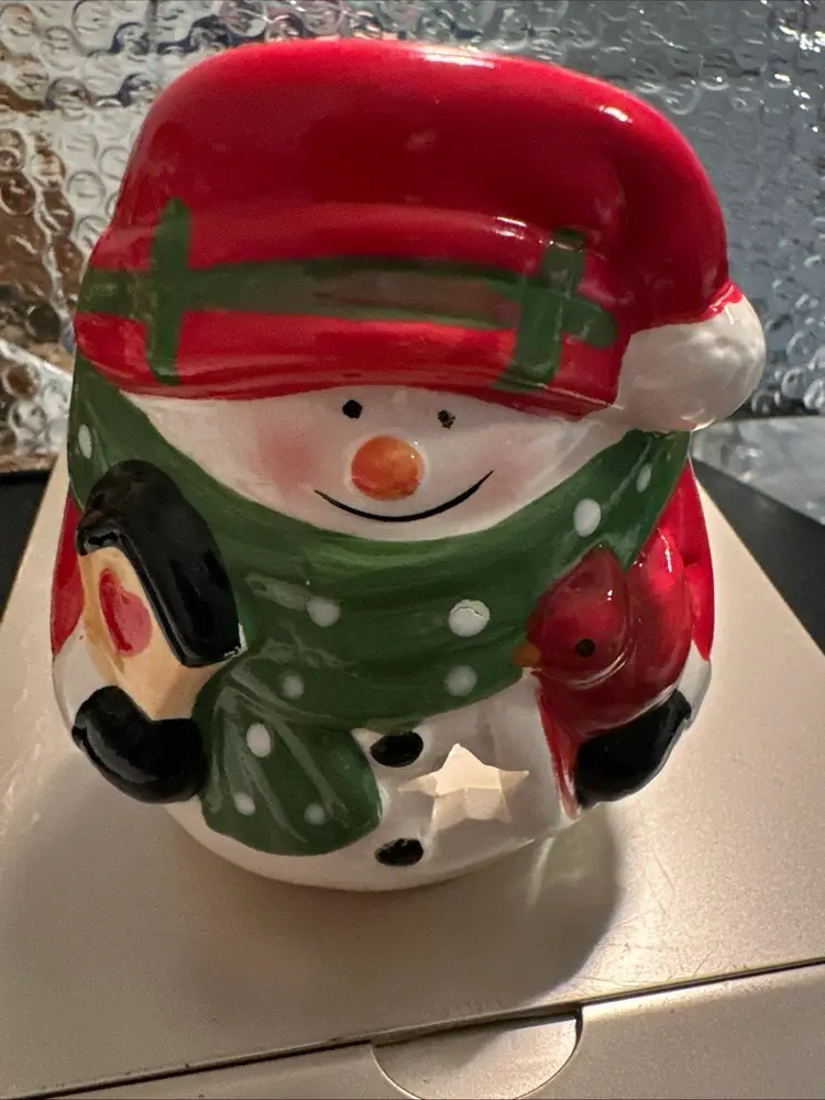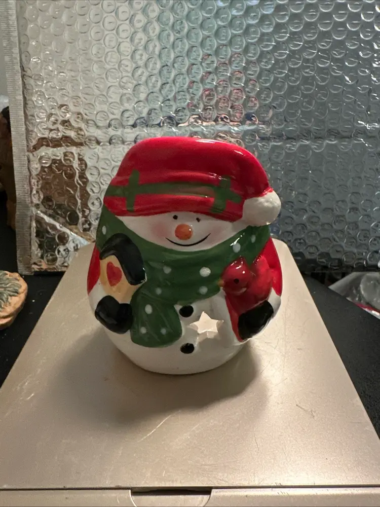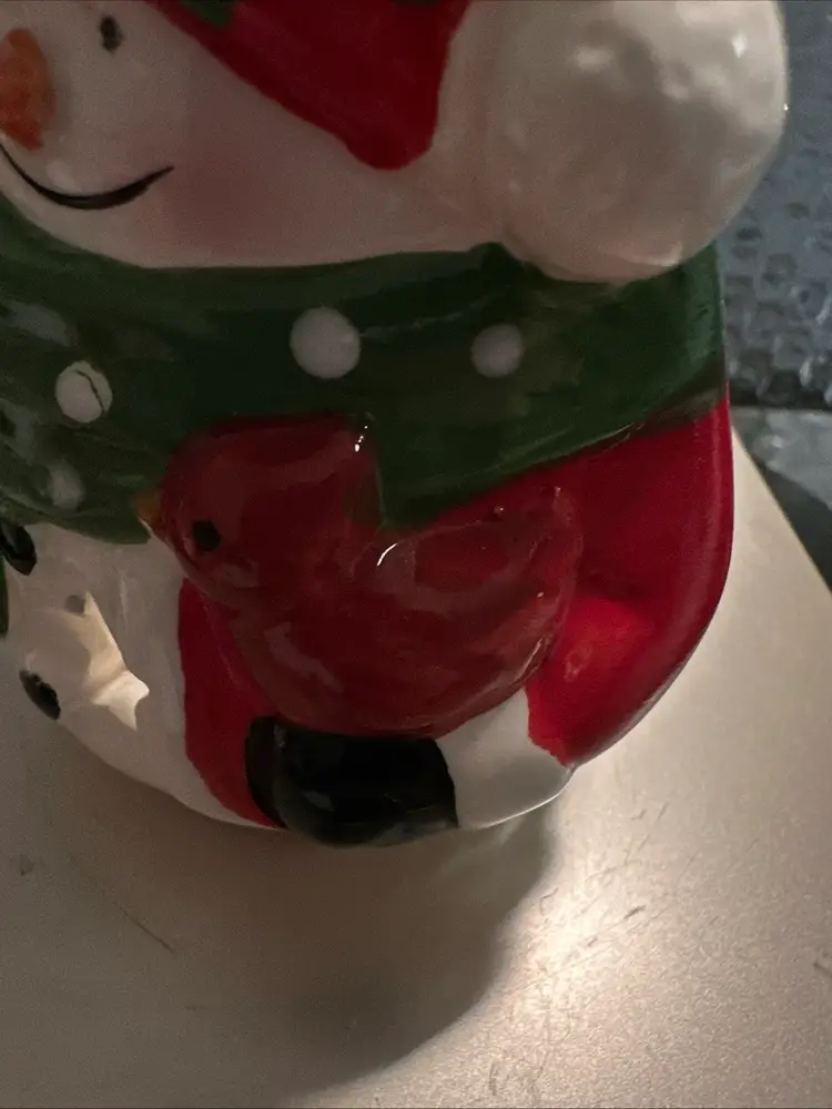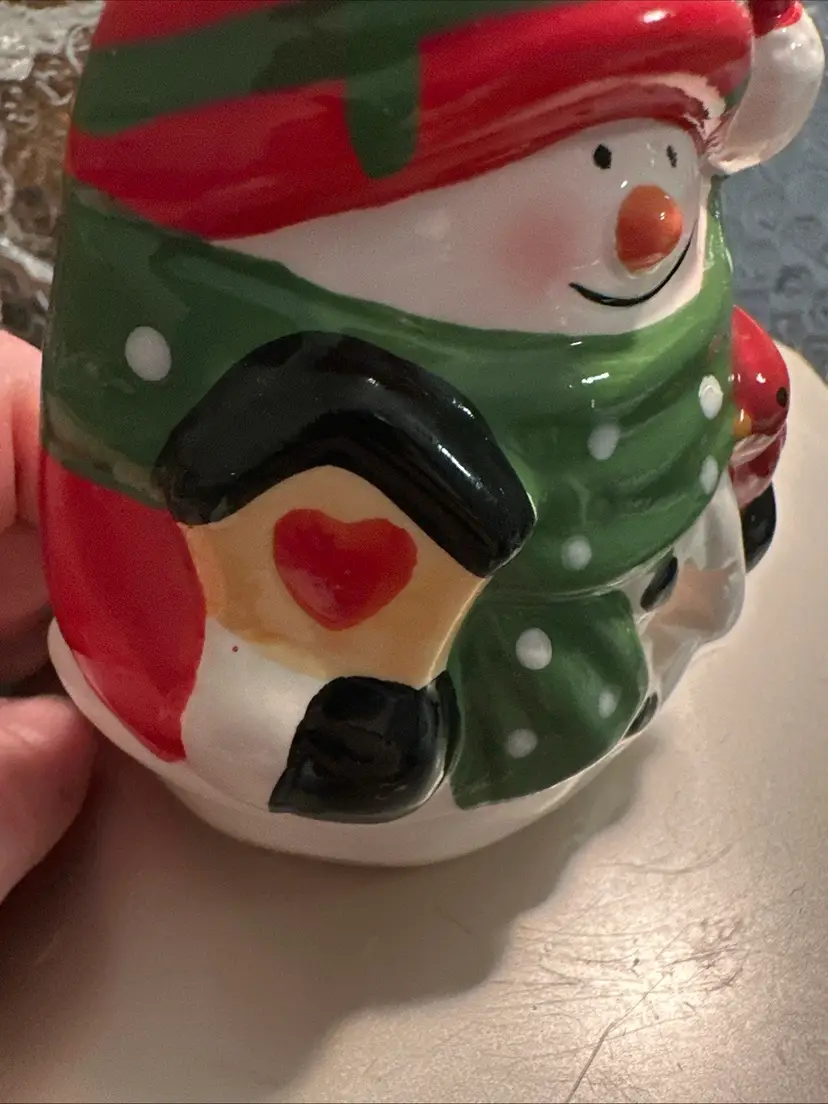 This ceramic snowman has a green scarf with white polka dots. He is holding a cardinal in one arm and a birdhouse in the other with a red heart in the center.