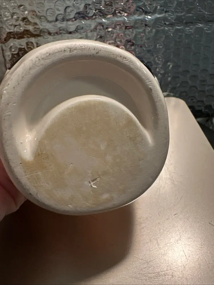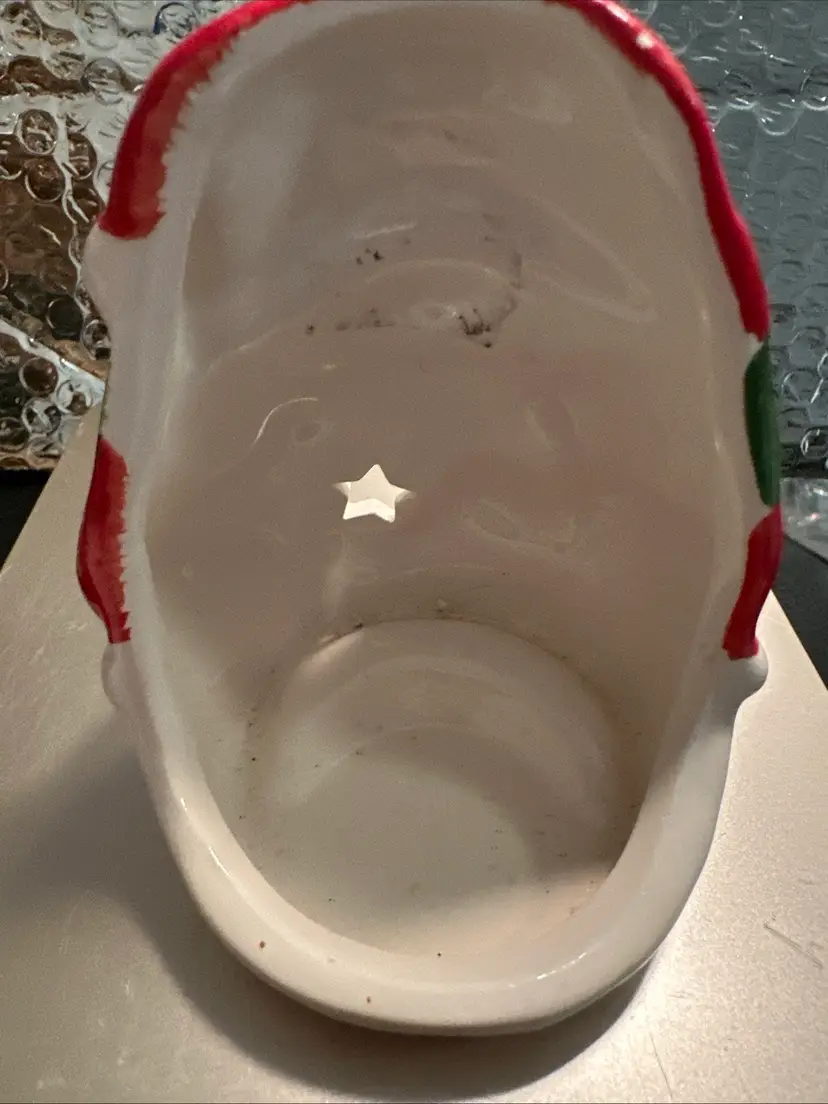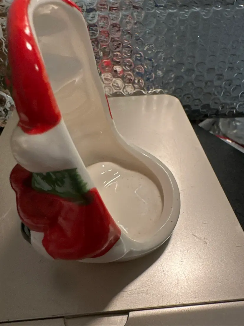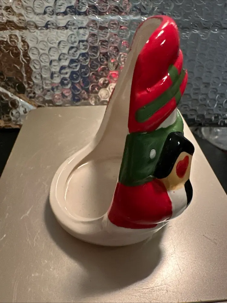 This ceramic snowman has a green scarf with white polka dots. He is holding a cardinal in one arm and a birdhouse in the other with a red heart in the center.