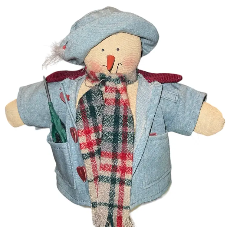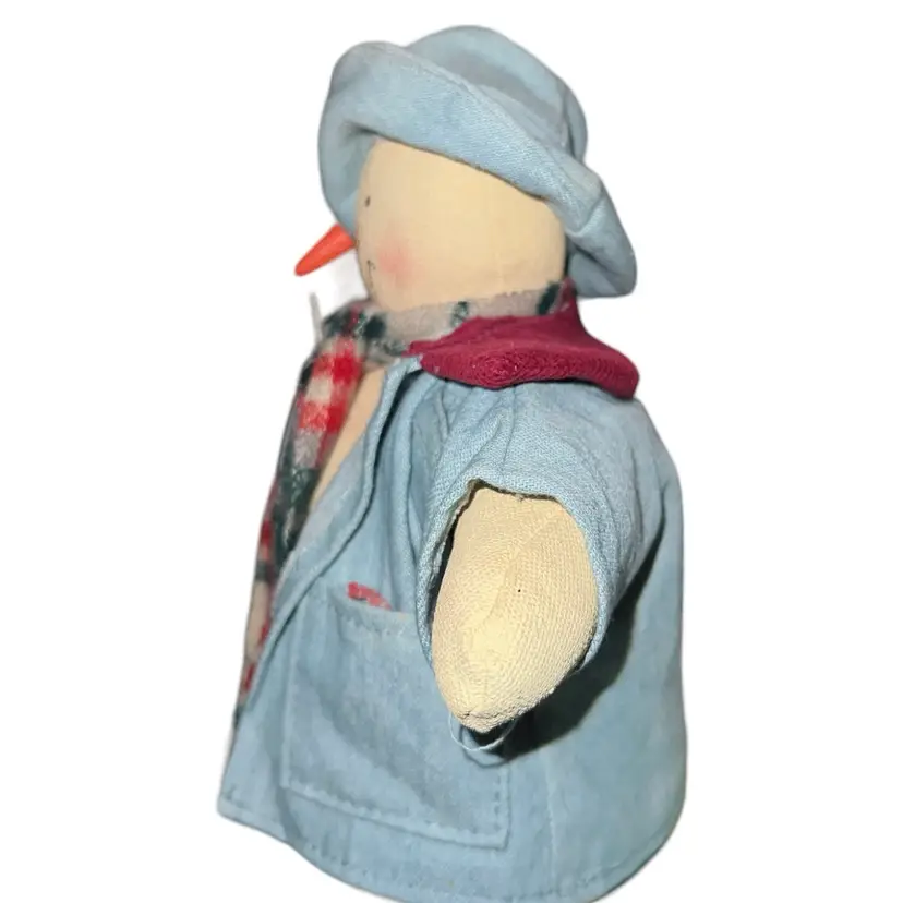 Add some winter charm to your home decor with this 8" x 8" snowman figurine. Made of canvas and denim material, this medium-sized snowman is dressed in a hat, scarf, and clothes and is perfect for any room in the house. The multicolor snowman with a fisherman theme will add a country primitive style to your home. This figurine is free-standing and easy to care for with just a damp cloth. It is a great addition to any winter decor and would make a perfect gift for teens and adults who love holiday figurines. Get into the winter spirit with this charming snowman figurine! Great condition