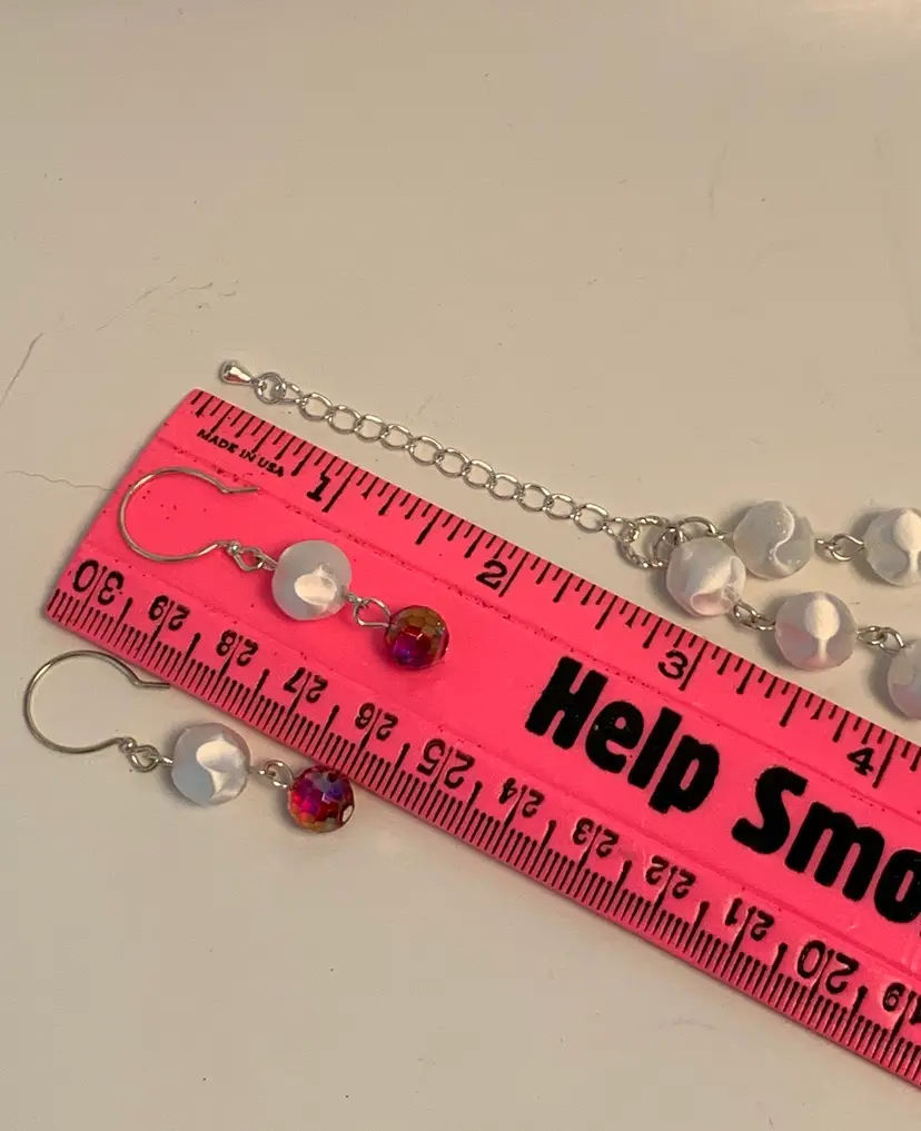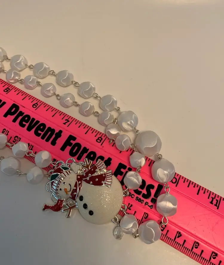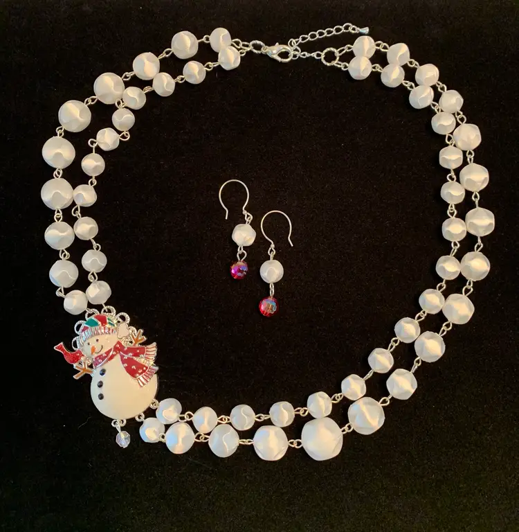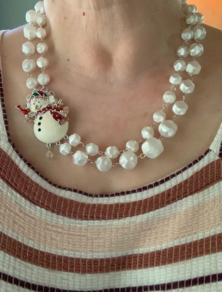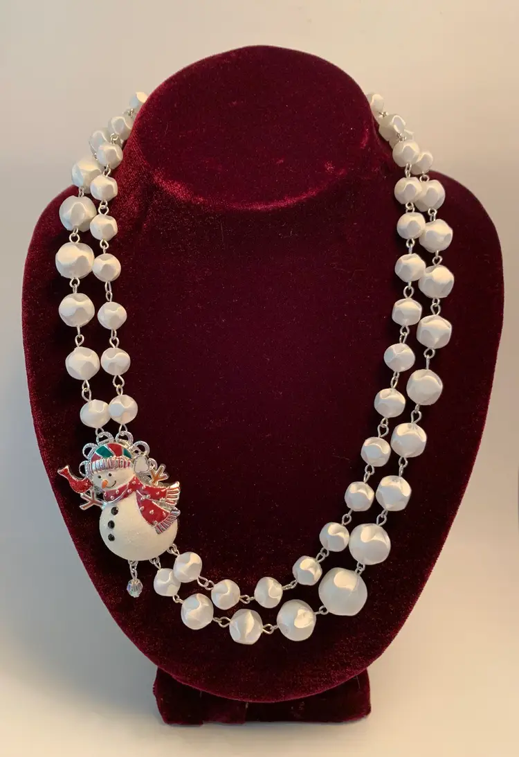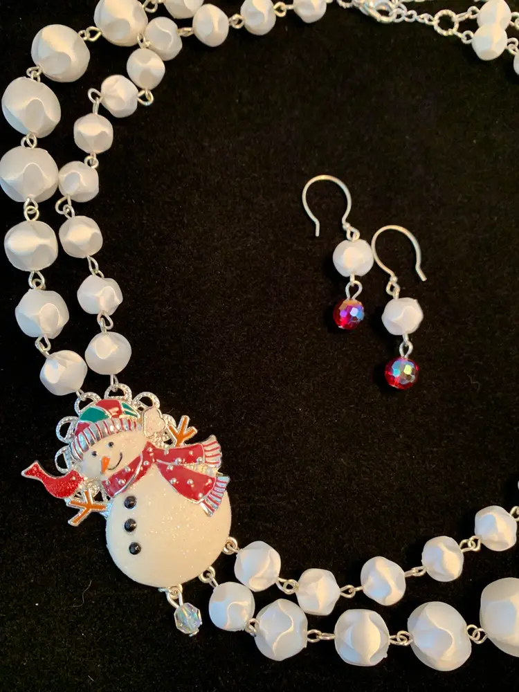 Double strand necklace made from a repurposed snowman brooch and snowball like beads from a repurposed mid century necklace. Matching pierced earrings have silver toned fishhook style findings. Necklace is 10” in wearable length with a 21/2” extension. Earrings are about 2” long.