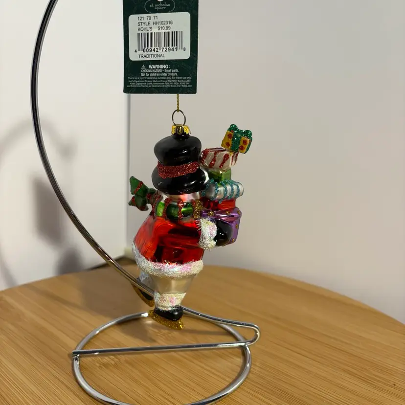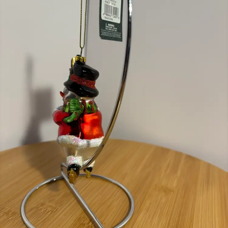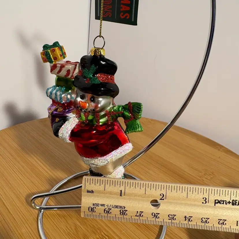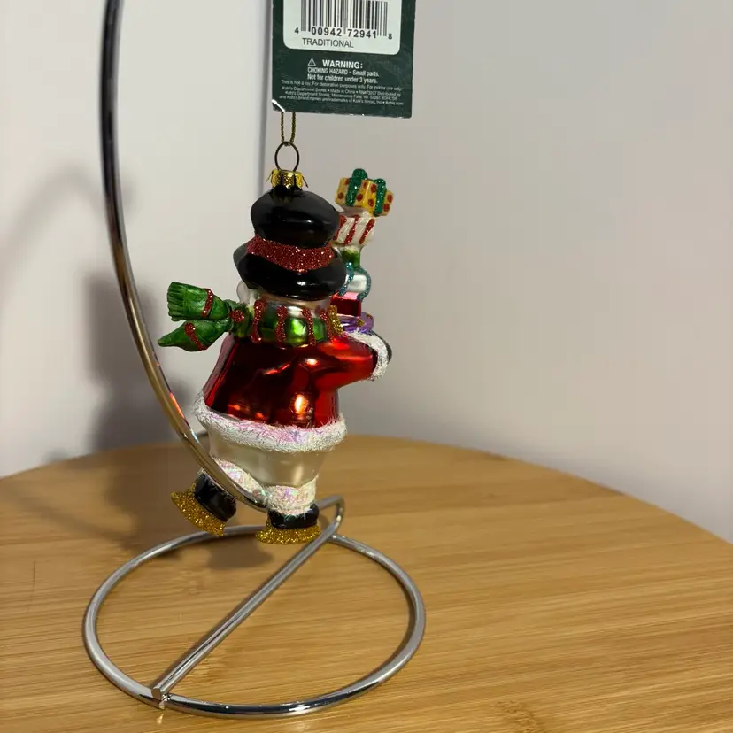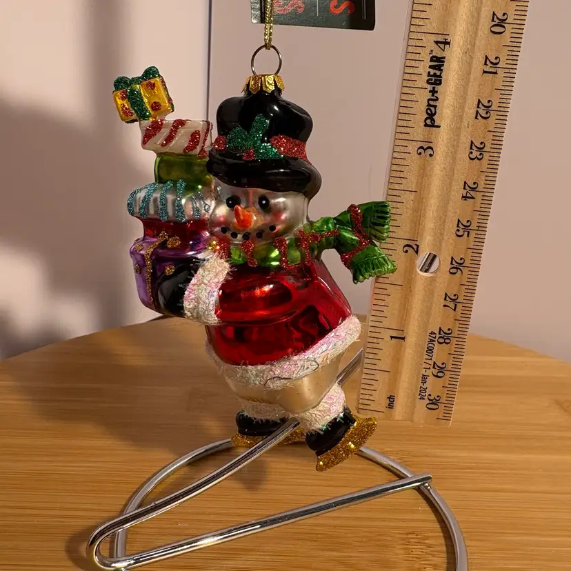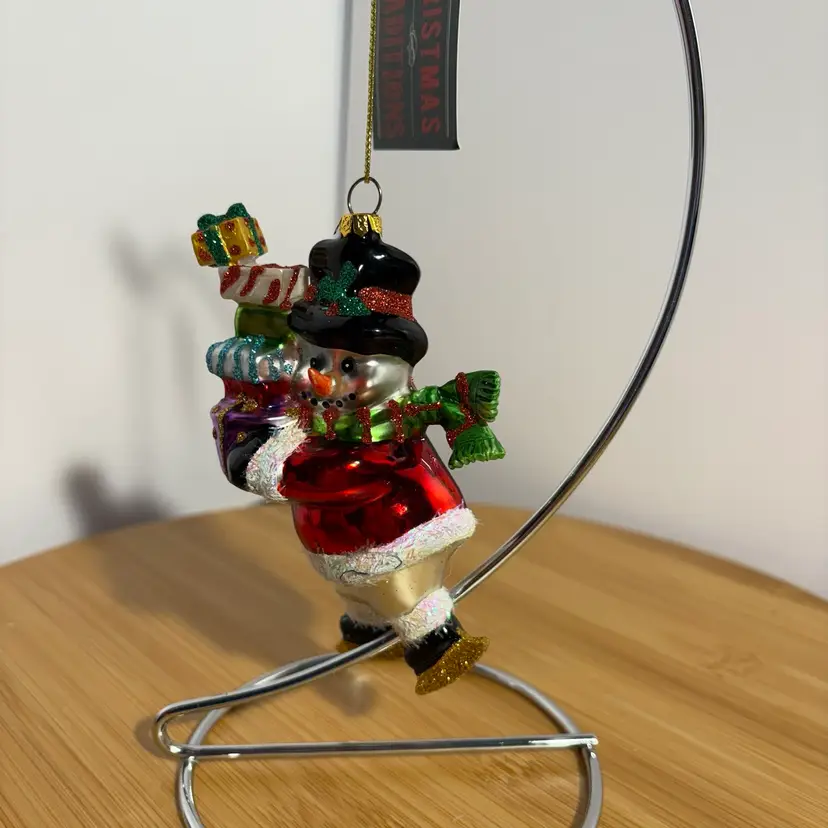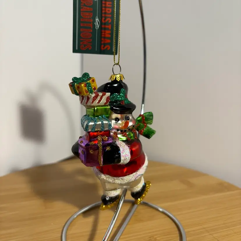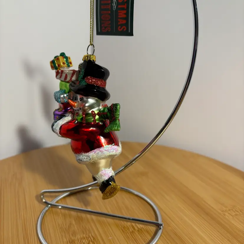 Snowman On Skates W/Gifts Presents Top Hat Blown Glass Christmas Ornament