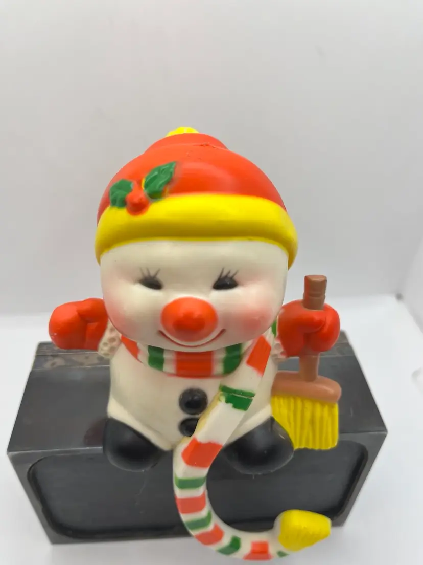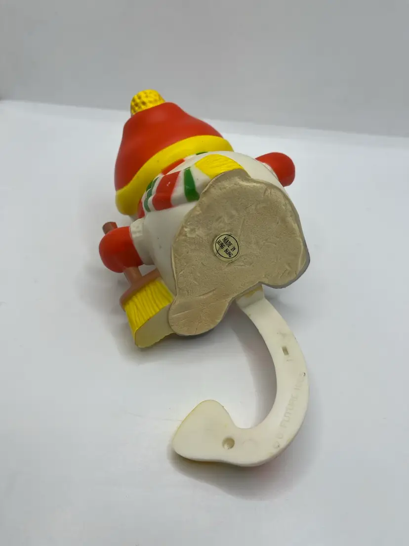 Here's a cheerful little snowman ready to brighten up your holidays! This listing is for a vintage 1985 stocking hook made by G. Future. It's made from a solid, hard plastic and has been painted in festive red, yellow, and green colors. The entire piece is approximately 6 inches tall, or 3 1/2 inches from the feet to the top of the head. Good overall condition with some paint rubs and a few marks.