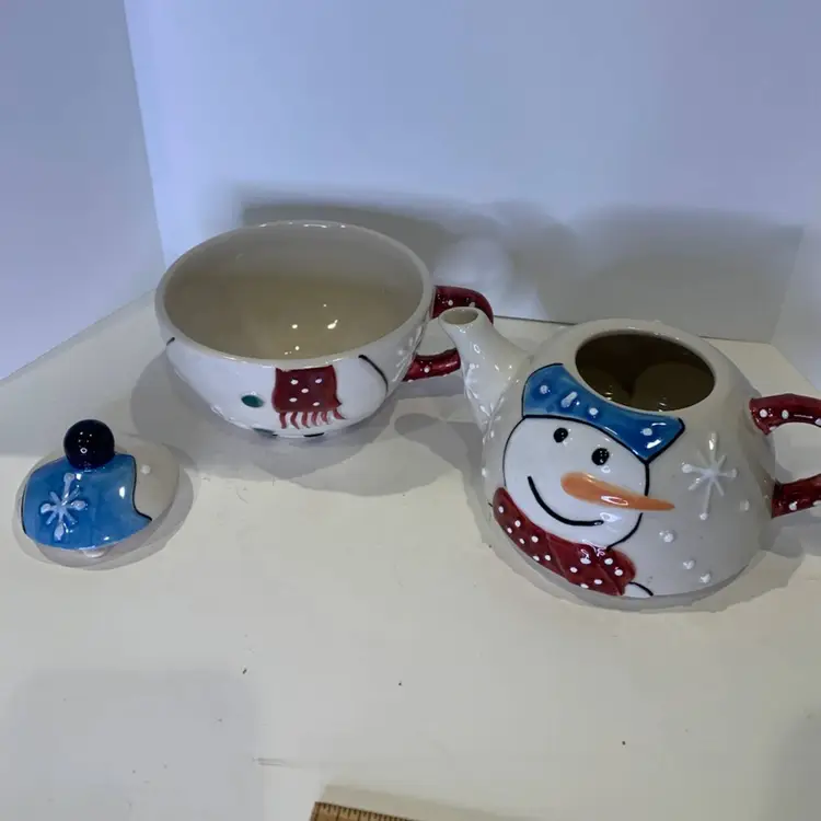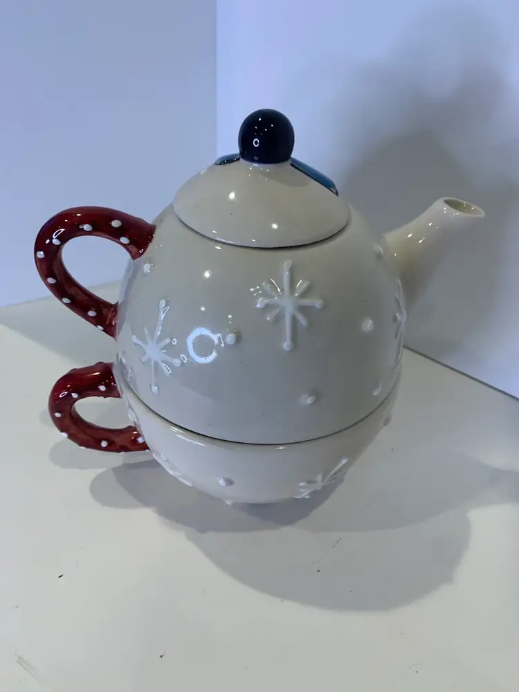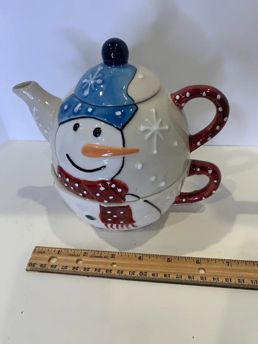 This ceramic snowman teapot brings a cozy winter touch to your kitchen or holiday table. The snowman breaks apart into a teapot and cup.