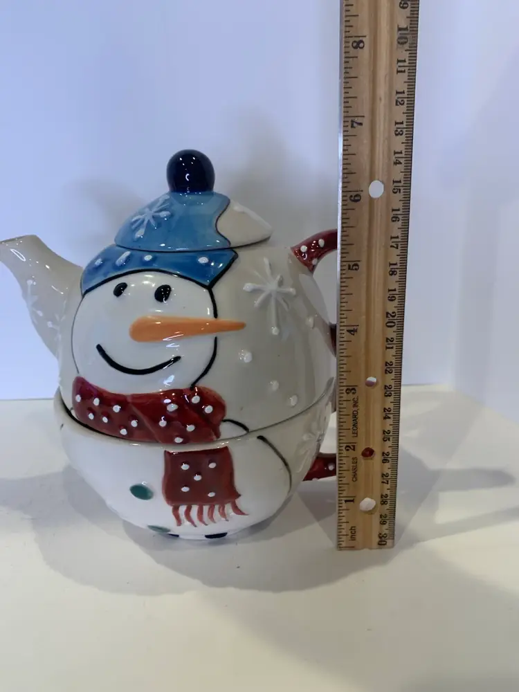 The teapot is shaped like a cheerful snowman, complete with a blue hat, red scarf, and classic carrot nose. Perfect for serving tea on cold winter days, this teapot doubles as a delightful decorative piece for the holiday season.