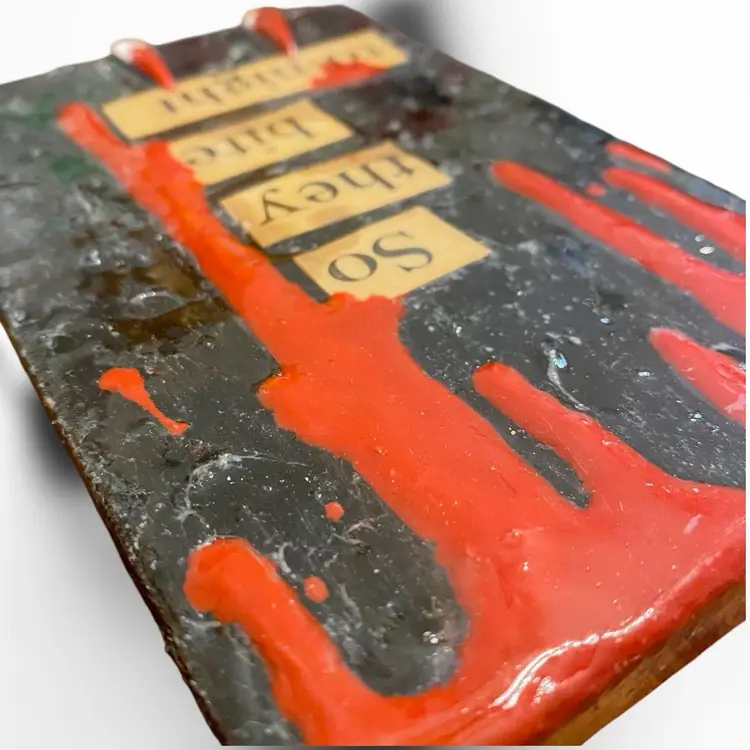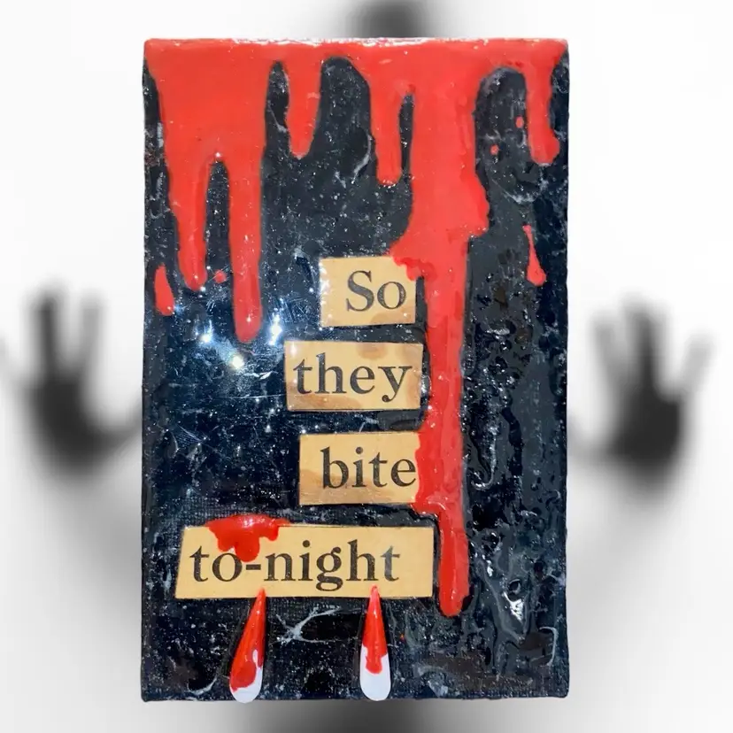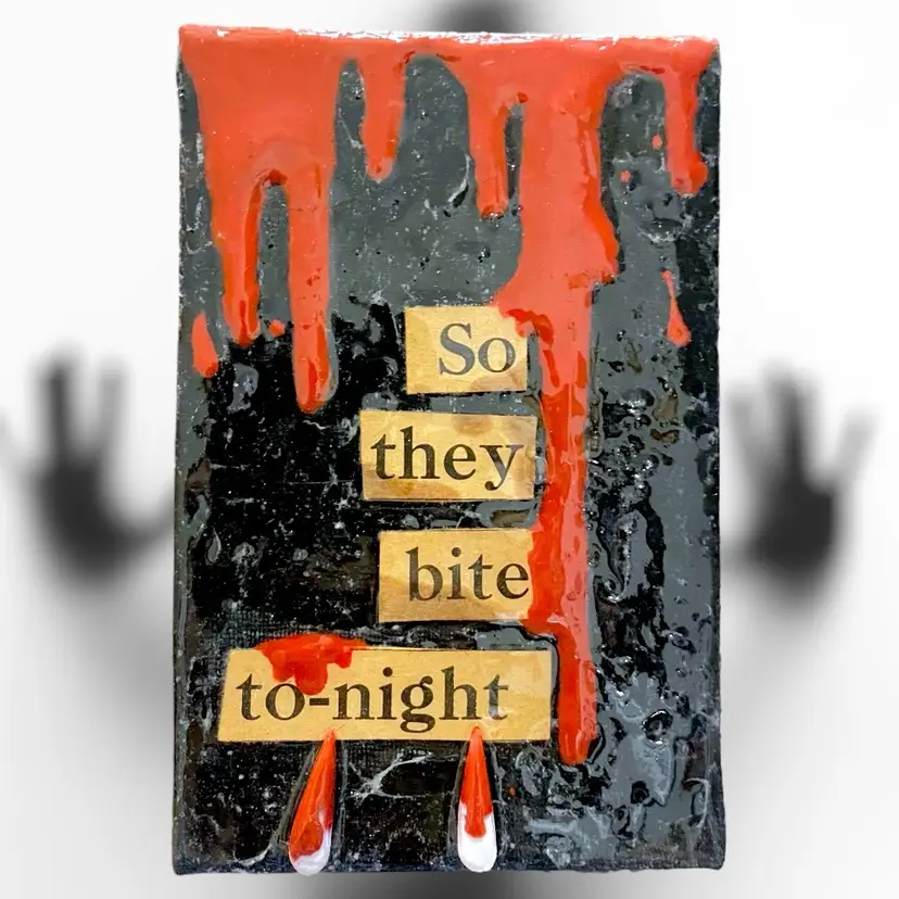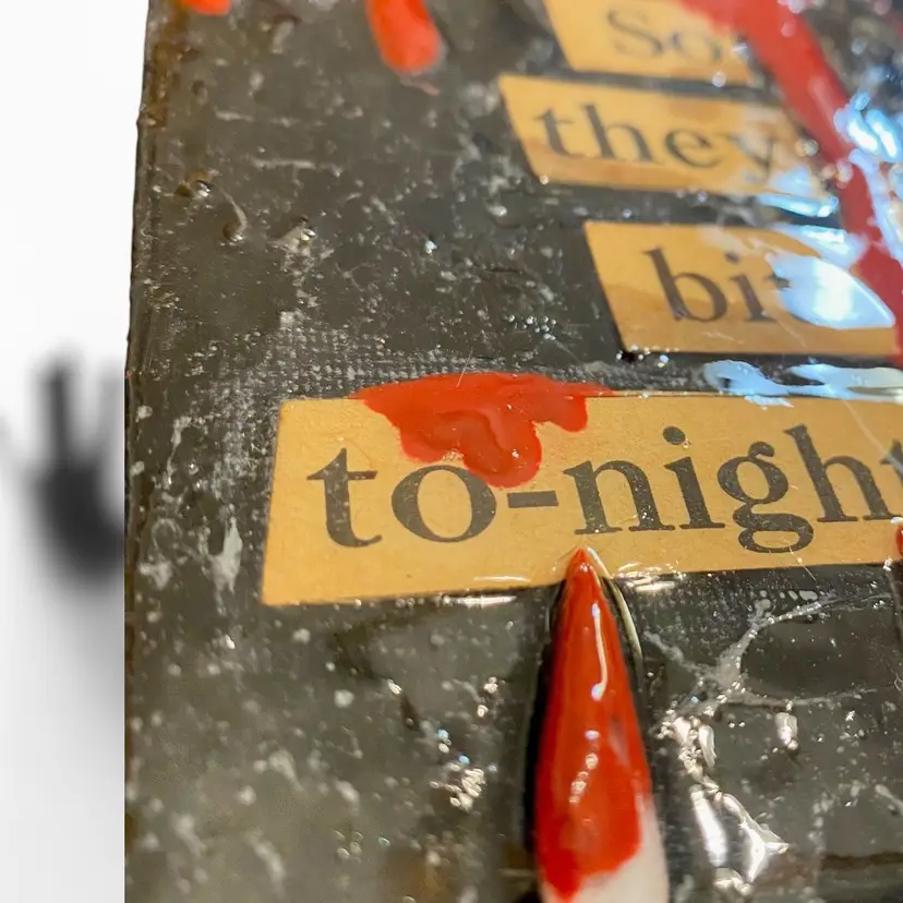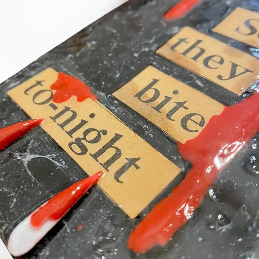 •handmade5x7 canvas art using vintage and antique word game letters/words by Wicked Kitty Kreations -textured cobweb-like background, 3d applied handmade fangs -backing of canvas is covered by a sheet of antique newspaper scraps; no wall hook