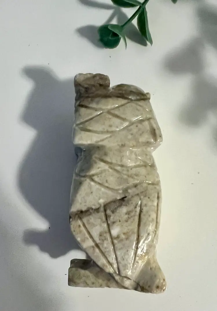 One of a kind, hand carved natural soapstone owl with green eyes. 2.5” tall. Free-standing.