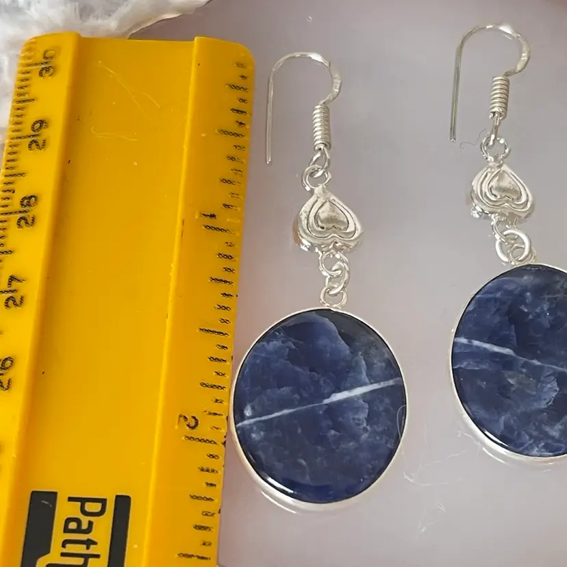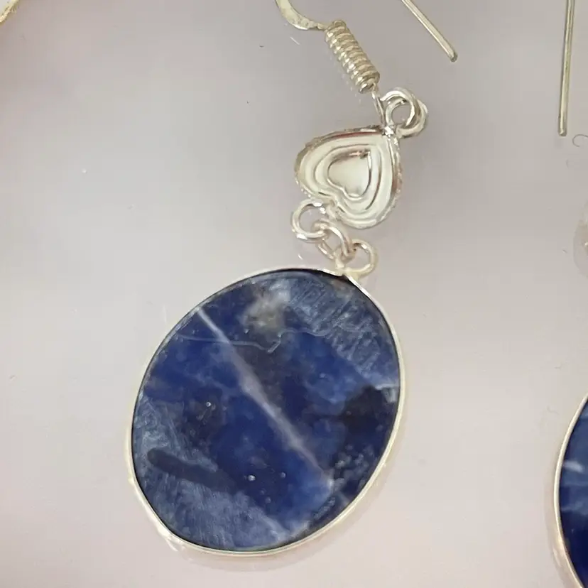 Sodalite blue stone dangle earrings featuring polished oval gemstones with natural white veining, consistent with sodalite, set in a silver tone frame and accented with delicate heart details. Approximately 2 1/4”