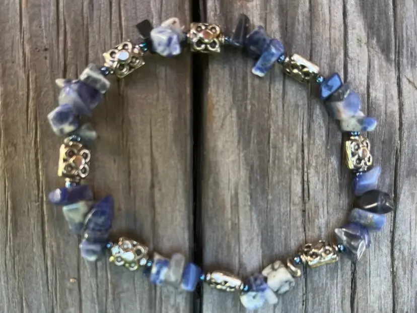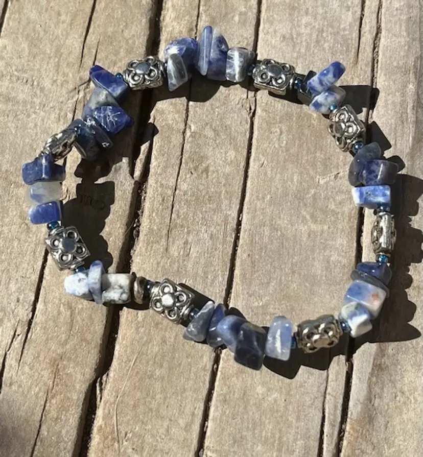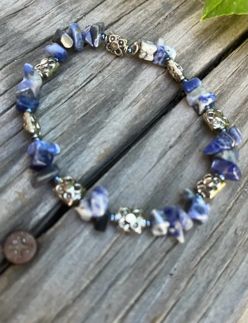 A Sodalite stretch bracelet that fits a 7 1/2 to 8 inch wrist.