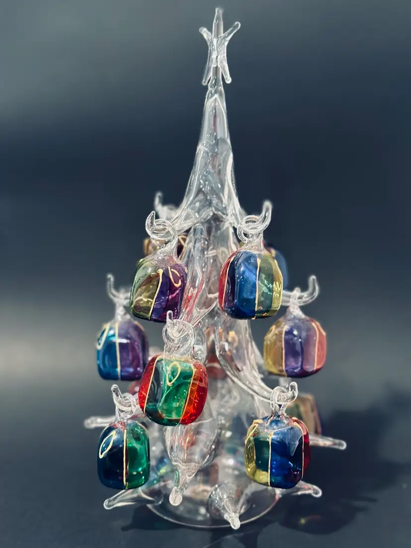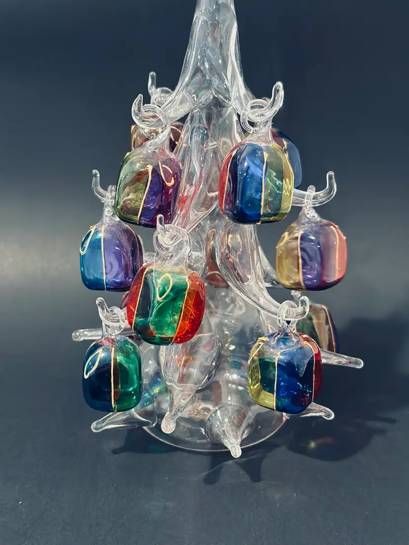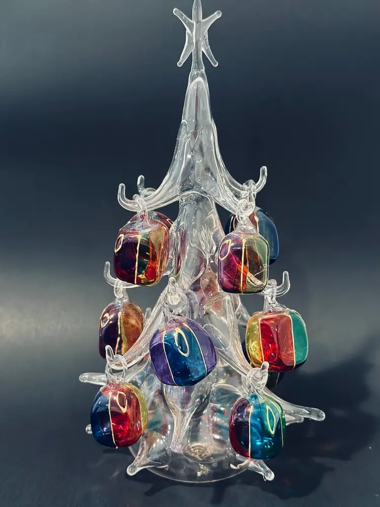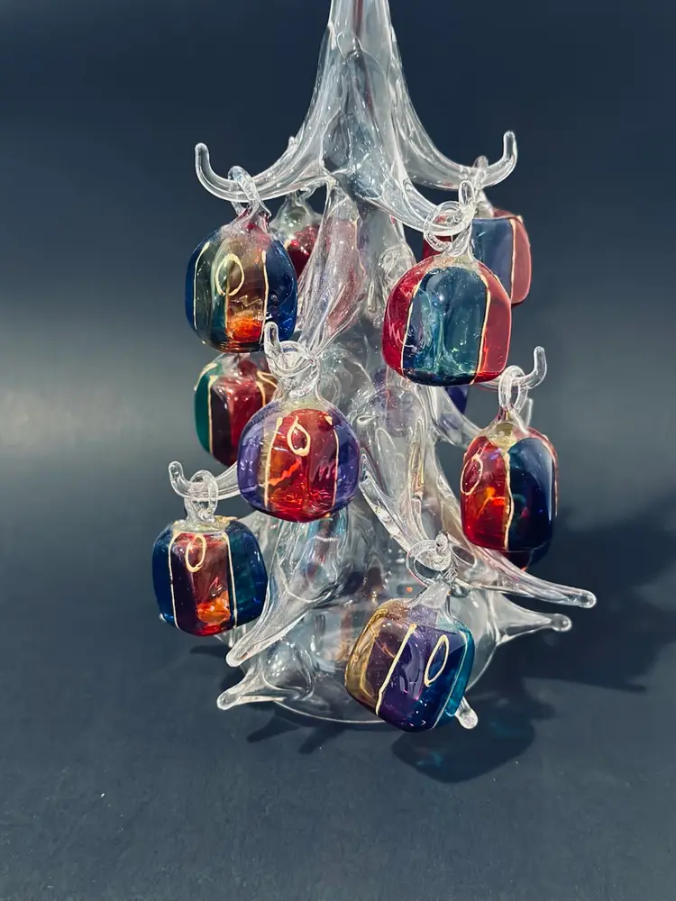 SOFFIERIA PARISE CHRISTMAS TREE HAND BLOWN ITALIAN ART GLASS W/ 12 ORNAMENTS 8”