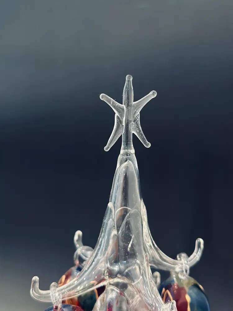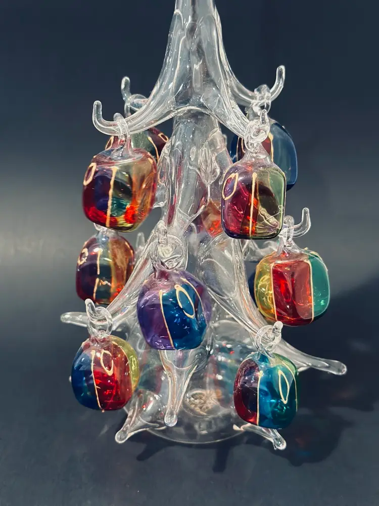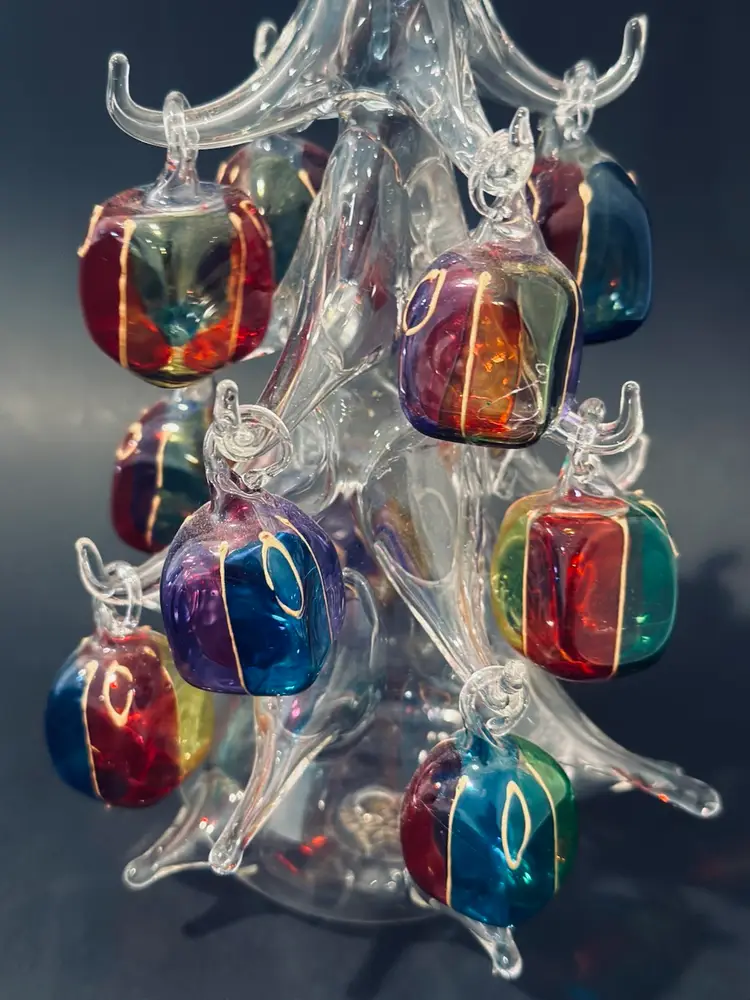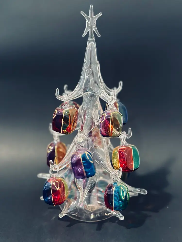 SOFFIERIA PARISE CHRISTMAS TREE HAND BLOWN ITALIAN ART GLASS W/ 12 ORNAMENTS 8”